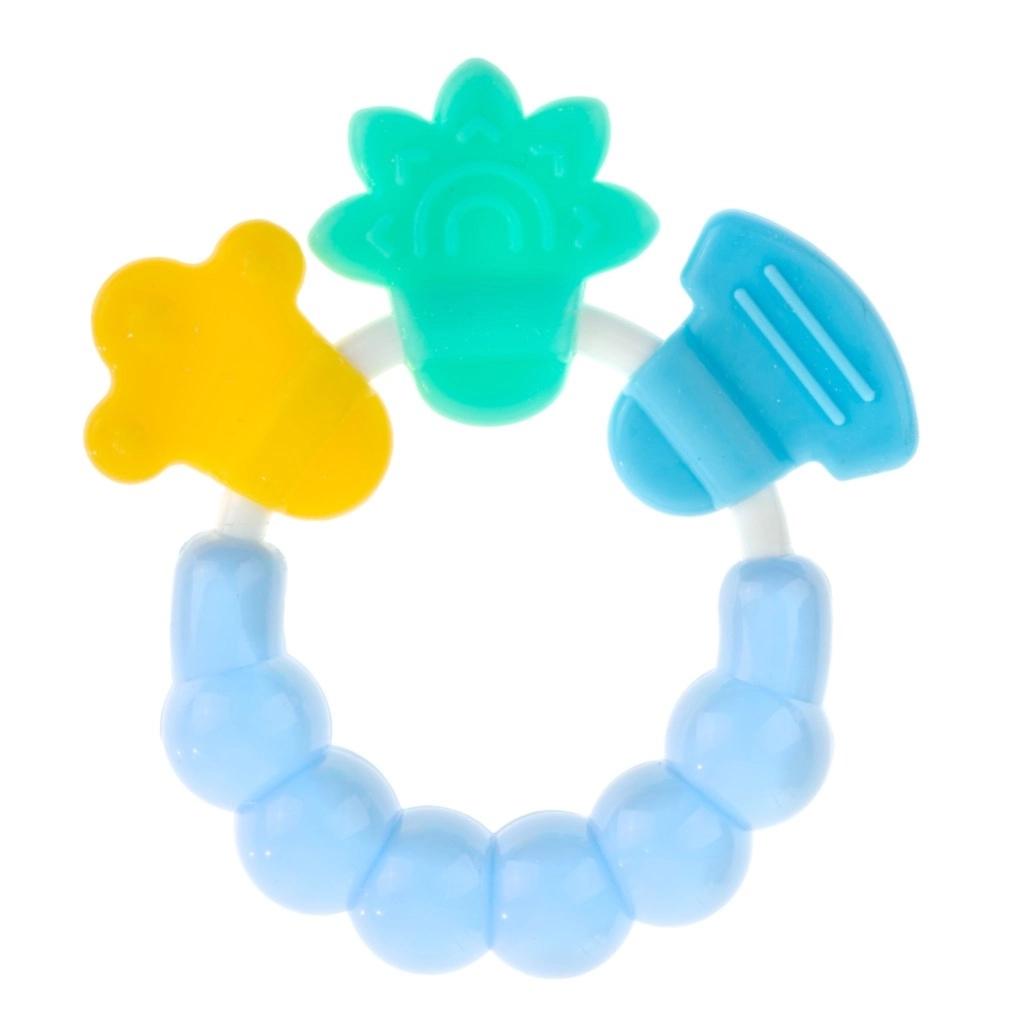 Praktyczna dziecięca grzechotka z gryzakiem marki Akuku w niebieskim kolorze. Łączy zabawne grzechotanie z ulgą podczas ząbkowania. Idealna dla małych rączek, bezpieczna i łatwa do umycia. Odpowiednia dla dzieci od 3 miesięcy, kompaktowy rozmiar ok. 9,5 cm.