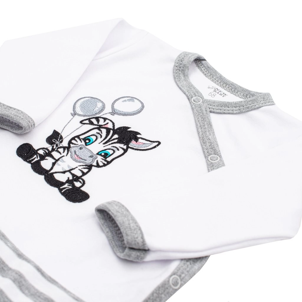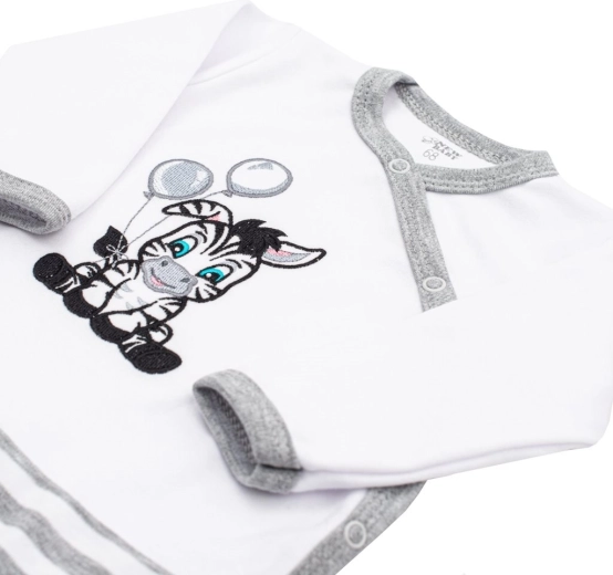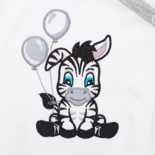 Uroczy motyw zebry jest podszyty materiałem, aby haft nie podrażniał wrażliwej skóry maluszka. Dolna część z pasiastym nadrukiem nadaje pajacykowi figlarny wygląd, a dzięki krojowi plecki pozostają zakryte nawet przy aktywnym ruchu.