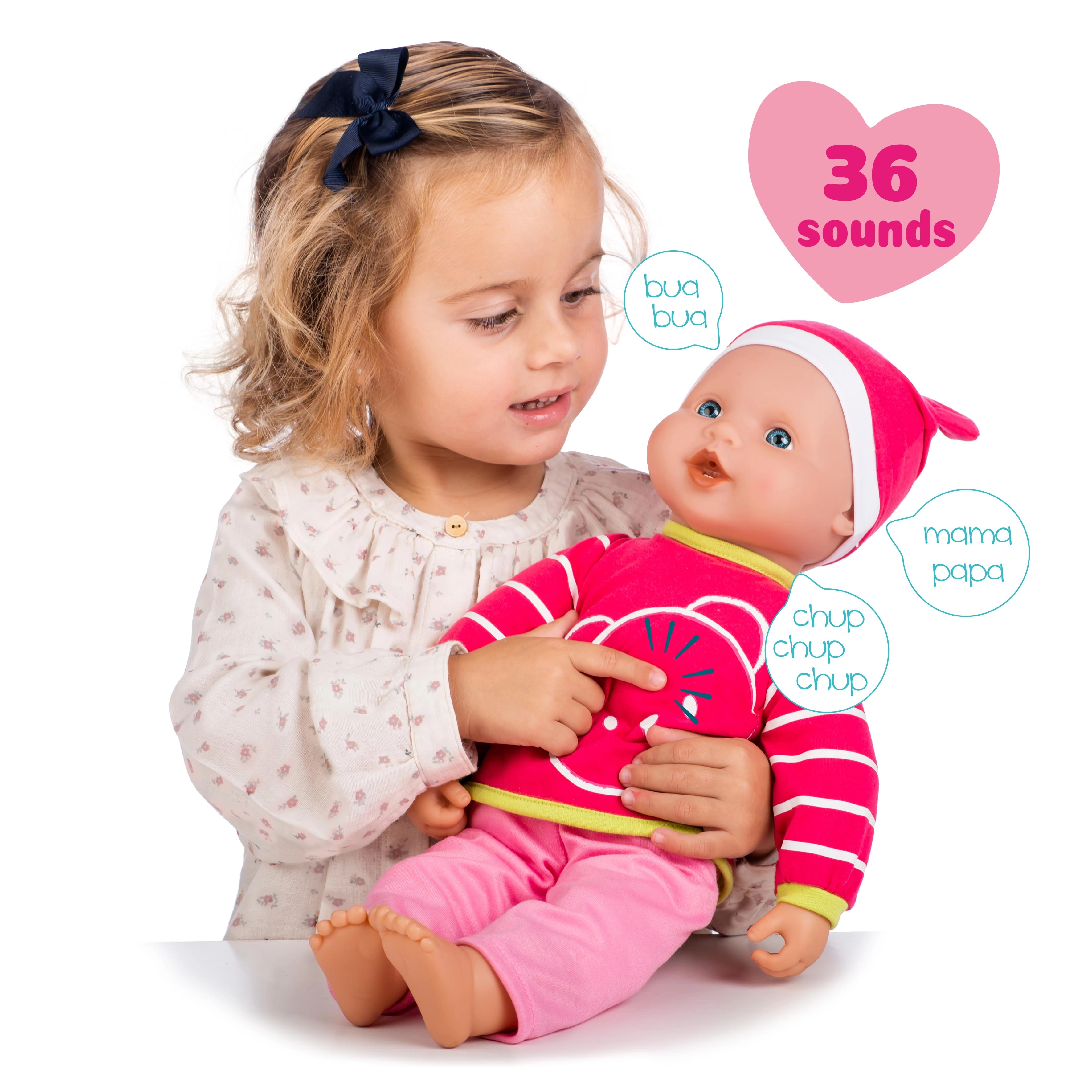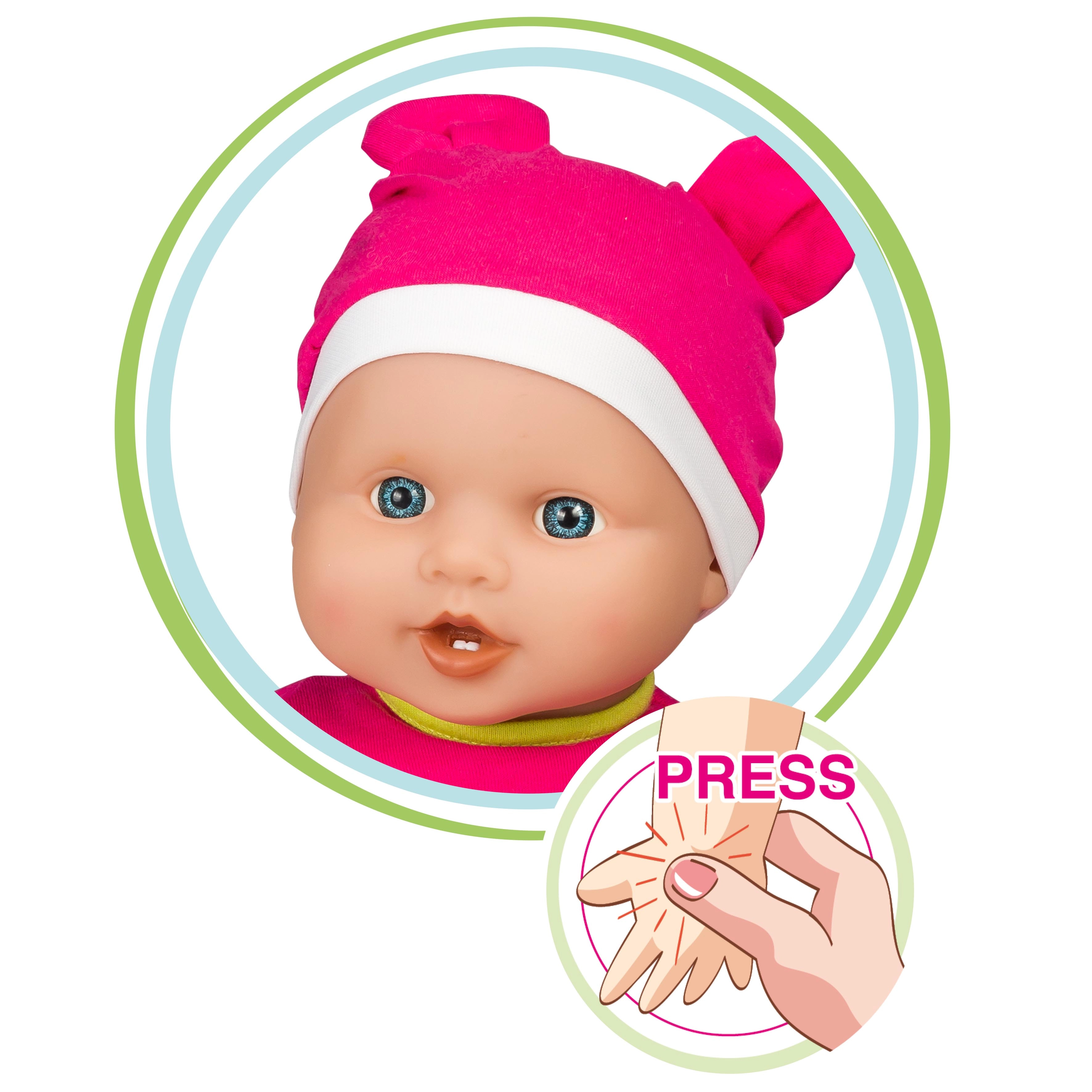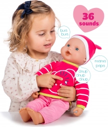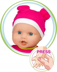 Po wciśnięciu przycisku na klatce piersiowej niemowlę wydaje 36 różnych dźwięków, które pobudzają dziecięcą wyobraźnię i rozwijają umiejętności społeczne podczas zabawy w odgrywanie ról. Baterie 3× LR44 są dołączone do zestawu, więc zabawa może rozpocząć się natychmiast.