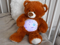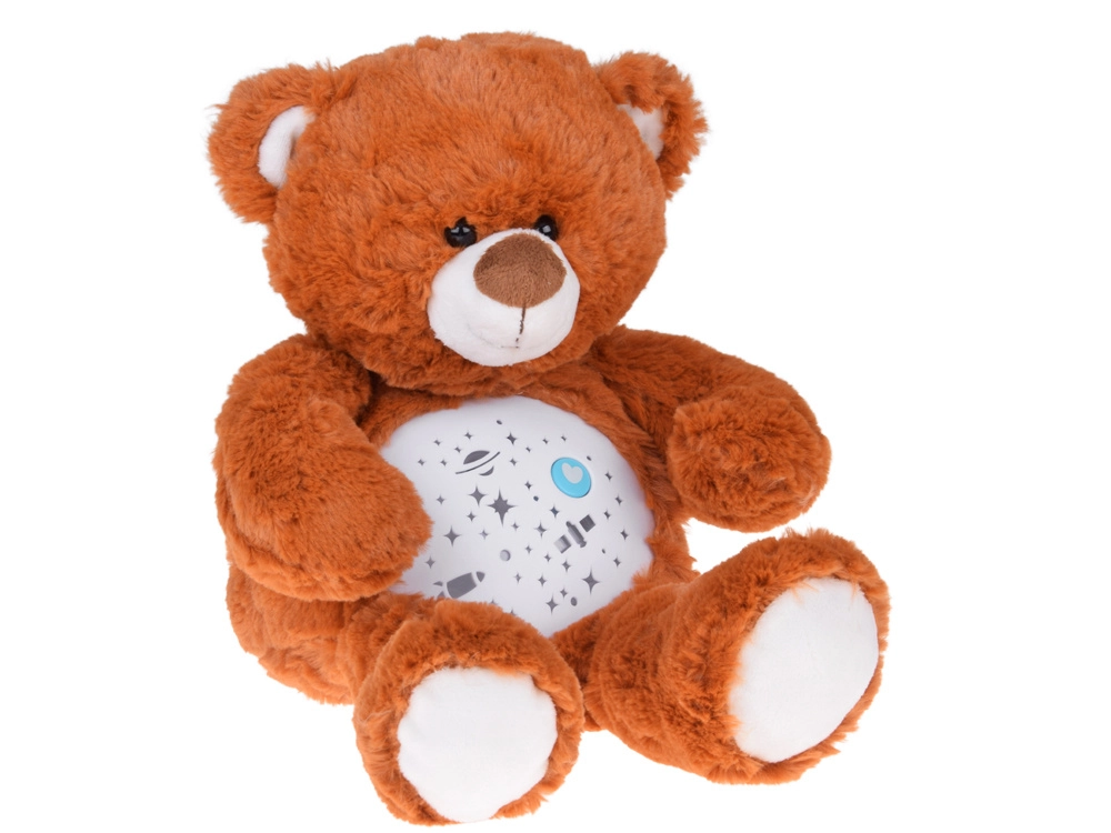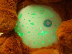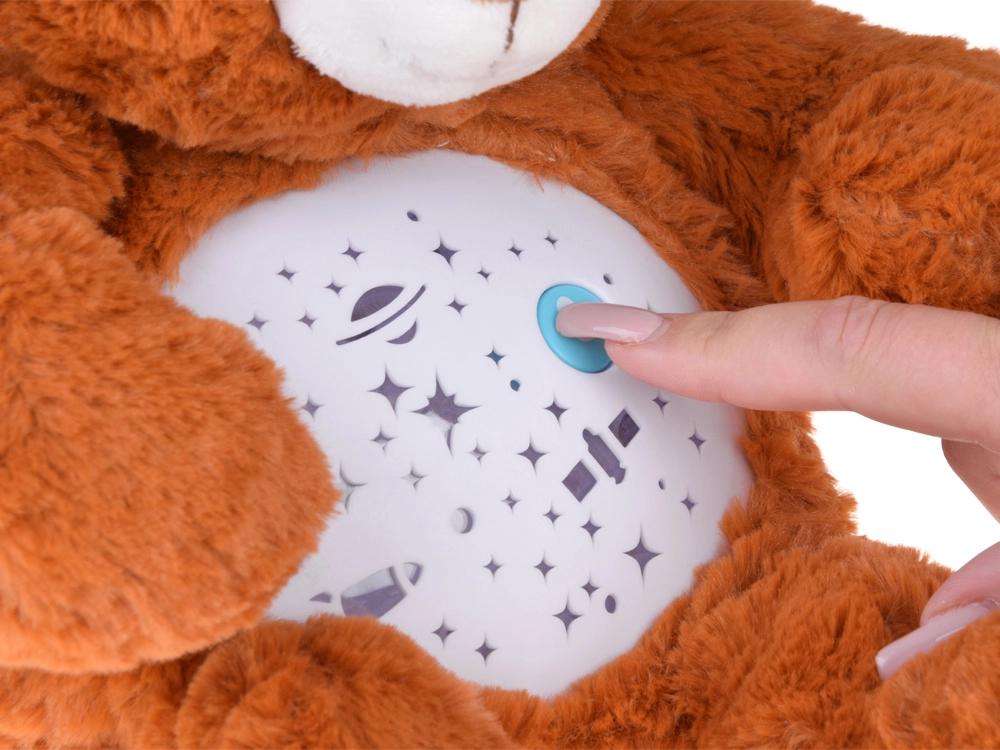 Pluszowy miś z projektorem gwiazd pomaga dzieciom zasnąć szybciej i spokojniej. Z brzuszka misia wyświetlane są gwiazdki, księżyc, planety i rakiety, którym towarzyszą uspokajające melodie oraz delikatnie zmieniające się światło. Dzięki dwustopniowej regulacji głośności łatwo dopasujesz dźwięk do wrażliwych uszek maluszka.