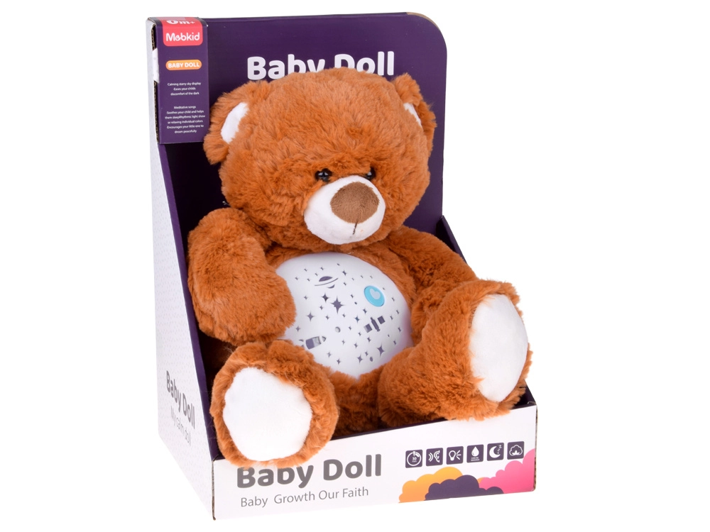 Uroczy pluszowy miś z wbudowanym projektorem zamieni pokój dziecięcy w spokojne niebo pełne gwiazdek. Oferuje kołysanki i delikatne melodie, zmieniające się stonowane światło oraz automatyczne wyłączenie po 30 minutach. Miękki, przyjemny materiał i wyjmowany panel interaktywny dla łatwego czyszczenia czynią misia idealnym towarzyszem spokojnego zasypiania.