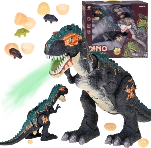 Duży interaktywny dinozaur T‑Rex z parą, światłami i dźwiękami, składa jajka