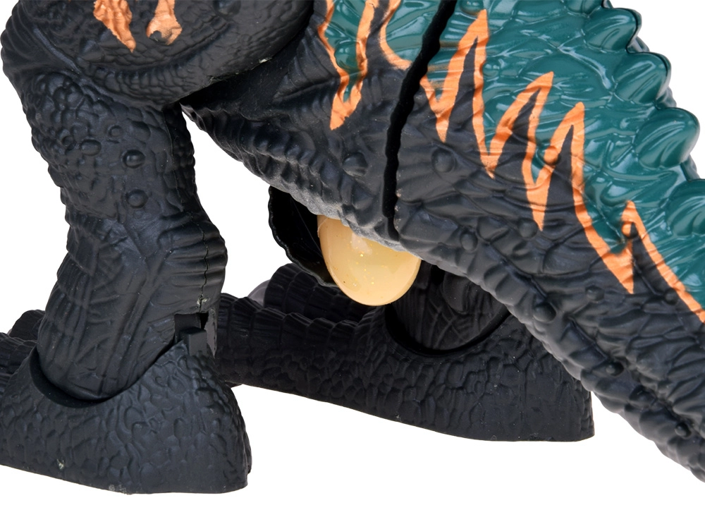 Unikalny efekt pary: pod czarnym szpicem na głowie znajduje się zbiornik na wodę. Po napełnieniu dołączoną buteleczką dinozaur wypuszcza parę z pyska, dodatkowo podświetlaną diodą LED, co tworzy oszałamiający efekt wizualny. Na grzbiecie znajduje się otwór do wkładania jajek – T‑Rex następnie je „znosi”. W zestawie są 3 otwierane jajka z kolekcjonerskimi figurkami młodych.