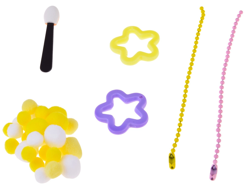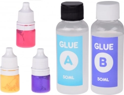- Forma na 2 śluzy, patyczek do mieszania, szczypczyki, 2× klej (A+B), miarka, gąbeczka/pacynka, 3× barwnik, miękkie dekoracyjne kuleczki, rękawiczki ochronne, 2× gwiazdka, 4× przezroczysty kubeczek, 2× ozdobny woreczek, 2× łańcuszek do breloczka, tacka