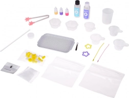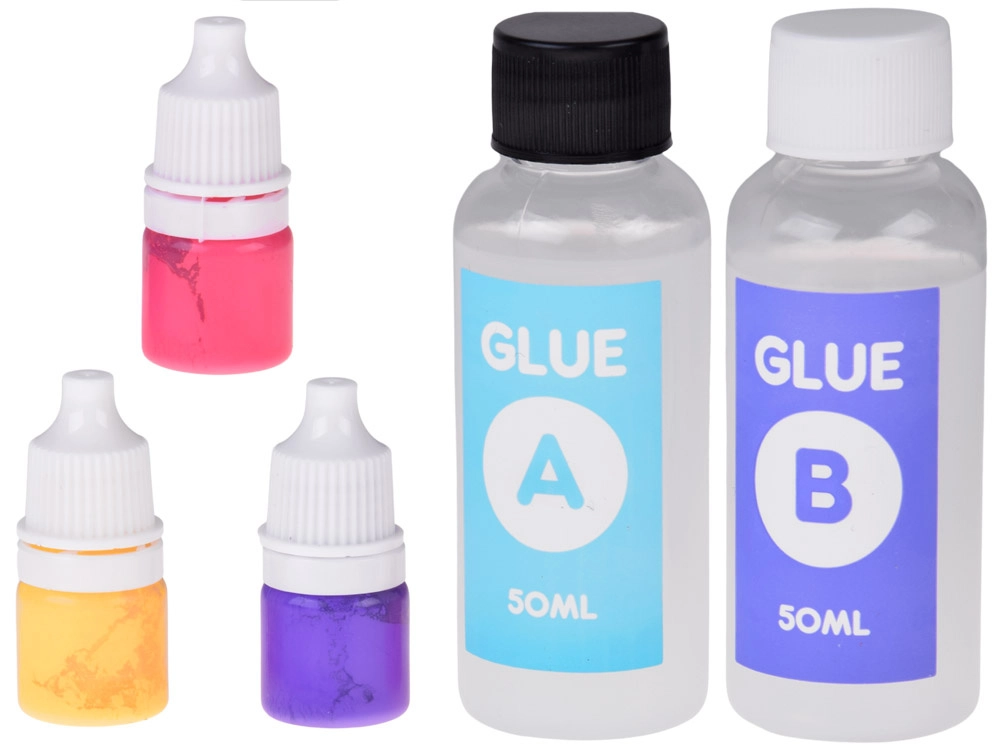 Zestaw zawiera miarki, miseczki, roztwory A i B, barwniki, patyczki, koraliki i woreczki – wszystko, co potrzebne do mieszania, barwienia, ozdabiania i przechowywania śluzu.