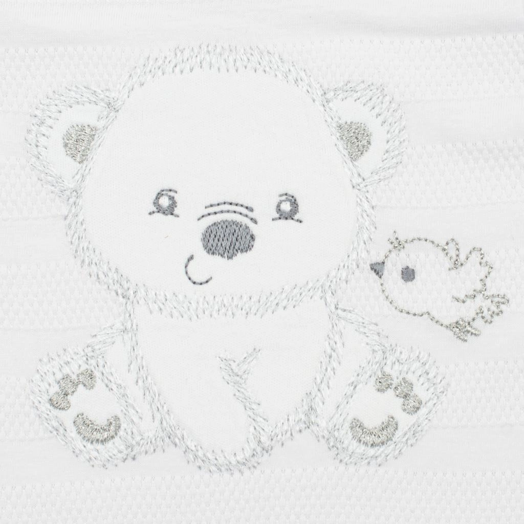 Zestaw dostarczany jest w ekologicznym pudełku prezentowym, dzięki czemu sprawdzi się także jako piękny prezent dla świeżo upieczonych rodziców. Wysokiej jakości 100% bawełna gwarantuje przyjemne noszenie, dobrą chłonność i łatwą pielęgnację. Neutralny biały kolor oraz urocze motywy misia i ptaszka czynią go uniwersalnym wyborem zarówno dla dziewczynek, jak i chłopców.