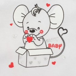 Praktyczne napy na ramieniu i między nóżkami umożliwiają szybkie ubieranie bez zbędnego stresu. Kontrastowe kolorowe lamówki oraz duży nadruk myszki tworzą uroczy design, który ucieszy zarówno dzieci, jak i rodziców.