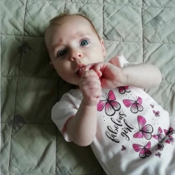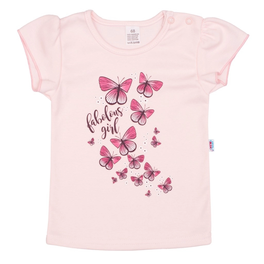 Uroczy 2‑częściowy zestaw dla dziewczynek New Baby Butterflies łączy wygodę i styl. Zawiera koszulkę z 100% bawełny z krótkimi, marszczonymi rękawkami i nadrukiem motylków oraz miękką melanżową spódniczkę z falbanką. Praktyczne zapięcie na napy na ramieniu ułatwia ubieranie, a szersza guma w pasie nie uciska brzuszka.