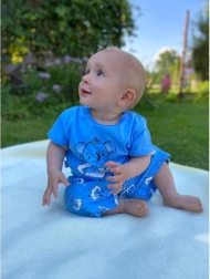 Spodenki z całopowierzchniowym nadrukiem misiów mają szerszy elastyczny pas dla maksymalnego komfortu bez ucisku. Zestaw nadaje się do spania oraz jako letni komplet do domu czy na spacer w wózku.