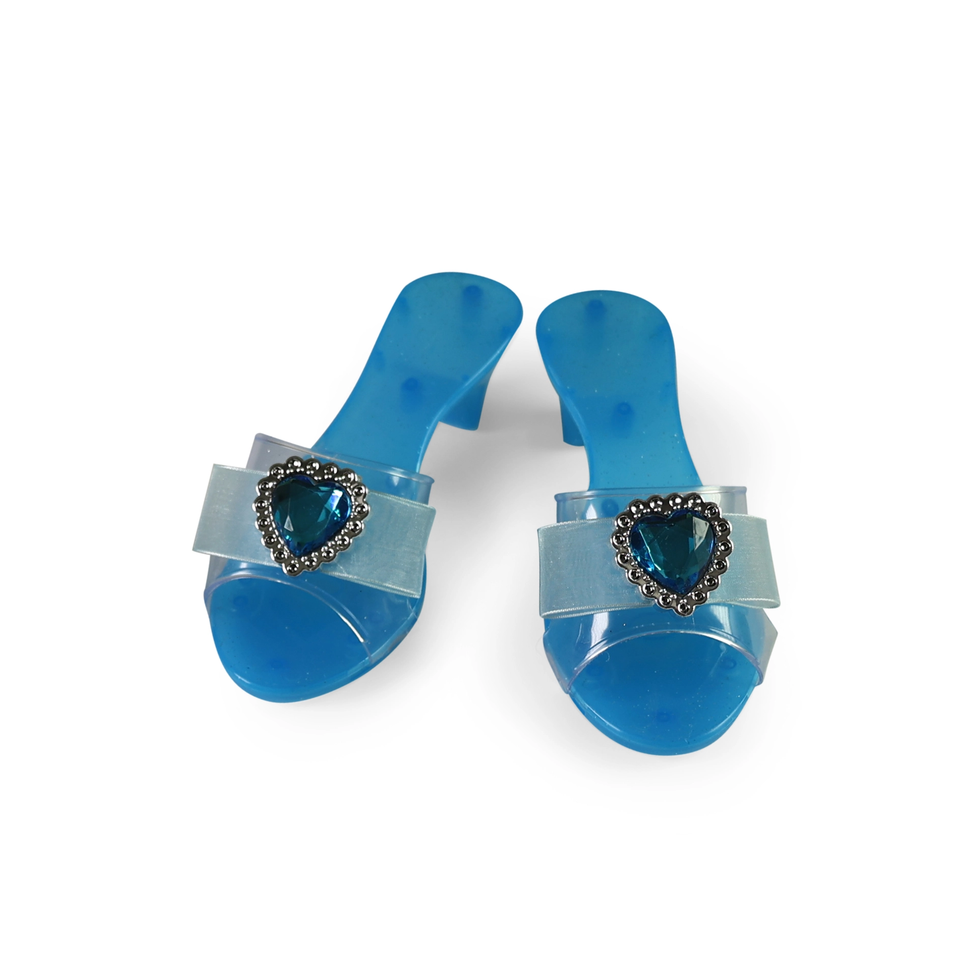 Lekkie plastikowe pantofelki z przezroczystym paskiem i niebieskim serduszkowym kamieniem łatwo się wkłada i doskonale uzupełnią każdy kostium.