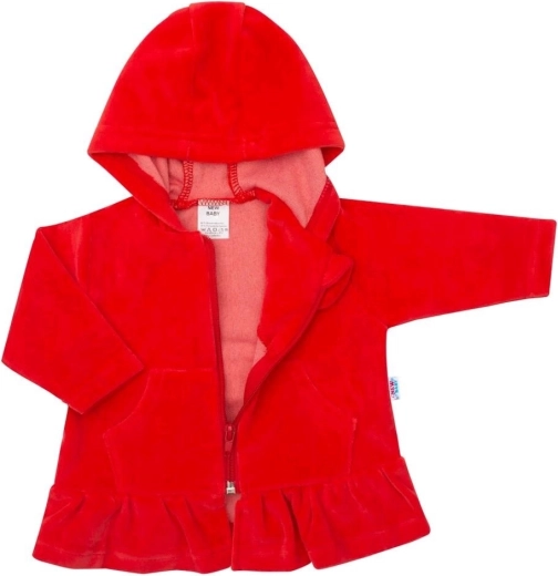 Wygodna dziecięca aksamitna bluza z kapturem marki New Baby w intensywnie czerwonym kolorze zachwyca miękkim materiałem i praktycznym zapięciem na zamek. Ma zamek na całej długości, ściągacze w pasie i na rękawach, a dzięki mieszance 80% bawełny i 20% poliestru idealnie sprawdza się na co dzień.