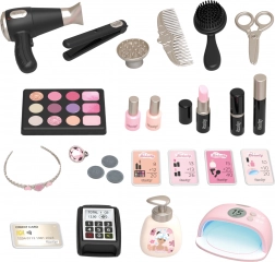 - Toaletka z lustrem, stołek ok. 27 cm, suszarka + 2 nasadki, prostownica, grzebień, szczotka, nożyczki, paletka, 2 pomadki, tusz do rzęs, 2 lakiery do paznokci, 6 buteleczek/pojemniczków kosmetycznych, opaska, pierścionek, terminal płatniczy, 3 monety, 4 paragony, karta płatnicza