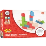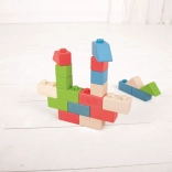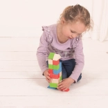 Drewniane klocki z plastikowymi łącznikami umożliwiają tworzenie solidnych i stabilnych struktur.