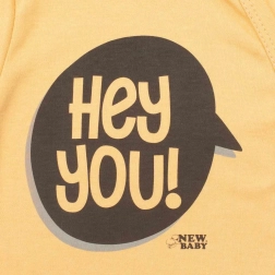 Musztardowa dziecięca koszulka NEW BABY With Love to idealny wybór na co dzień. Miękka, oddychająca 100% bawełna zapewnia maksymalny komfort i jest odpowiednia także dla wrażliwej skóry. Kontrastowe szare lamówki i zabawny napis Hey You! nadają koszulce nowoczesny wygląd.