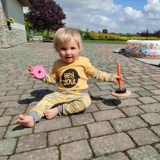 Praktyczne zapięcie na napy na ramieniu znacząco ułatwia ubieranie i rozbieranie, co doceni każdy rodzic. Koszulka z długim rękawem świetnie sprawdzi się do wózka, w domu i na spacery.