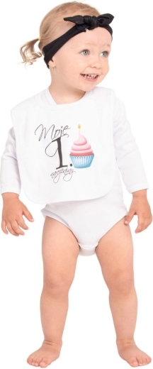 Nadruk z zabawnym napisem mama + tata = ja powstał z certyfikowanych farb odpowiednich dla niemowląt. Praktyczne zapięcie na napę ułatwia szybkie zakładanie i zdejmowanie, a białe lamowanie dodaje śliniakowi czystego wyglądu.