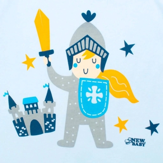 Ten dwuczęściowy zestaw NEW BABY Mały rycerz to idealny wybór dla maluszka w domu i na spacery. Śpioszki zdobi wesoły motyw dzielnego rycerza, kaftanik jest jednokolorowy i łatwy do łączenia z innymi elementami. Dzięki 100% bawełnie materiał jest delikatny, oddychający i przyjemny w dotyku, więc Twoje dziecko będzie czuło się komfortowo przez cały dzień.