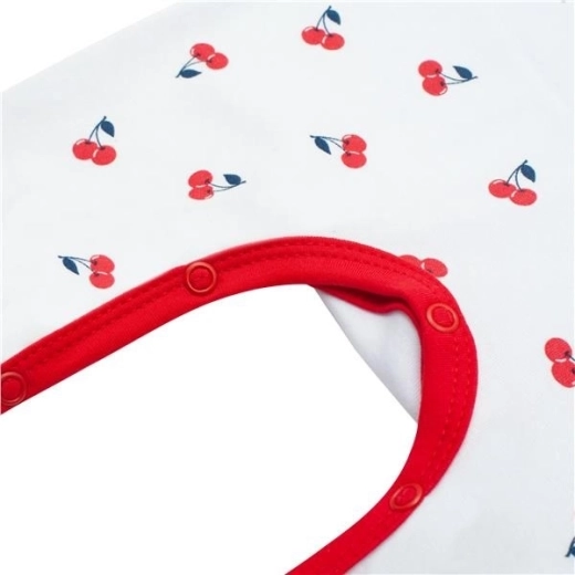Śpioszki NEW BABY Cherry z przyjemnej 100% bawełny to świetny wybór dla wrażliwej skóry dziecka. Górną część zdobi urocza naszywka z motywem czereśni, która jest podklejona, aby nie drażniła. Dolna część ma całopowierzchniowy nadruk w czereśnie, a kontrastowa lamówka wokół dekoltu i ramiączek dodaje stylowego wyglądu.