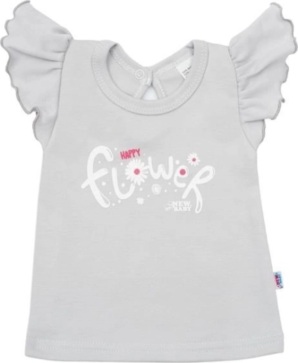 Uroczy i wygodny niemowlęcy komplet NEW BABY Happy Flower w szarym kolorze obejmuje bluzkę z falbankowymi rękawkami oraz spodenki dresowe z kwiatowym nadrukiem. Przyjemny materiał ze 100% bawełny jest delikatny dla wrażliwej skóry dziecka, zapięcie na zatrzask przy szyjce ułatwia ubieranie, a szerszy elastyczny ściągacz spodenek zapewnia wygodę przez cały dzień.