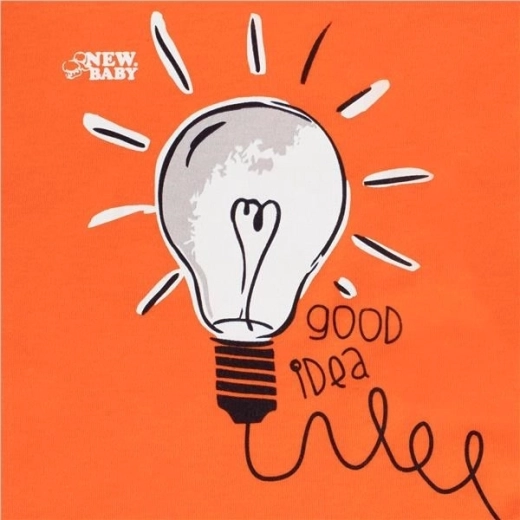 Urocza dziecięca koszulka NEW BABY z miękkiej 100% bawełny z długim rękawem i radosnym, całopowierzchniowym nadrukiem żarówek z napisem good idea. Wygodne zapięcie na ramieniu na napę ułatwia ubieranie, kontrastowe lamowanie dodaje stylu, a miękki i oddychający materiał jest delikatny dla dziecięcej skóry.