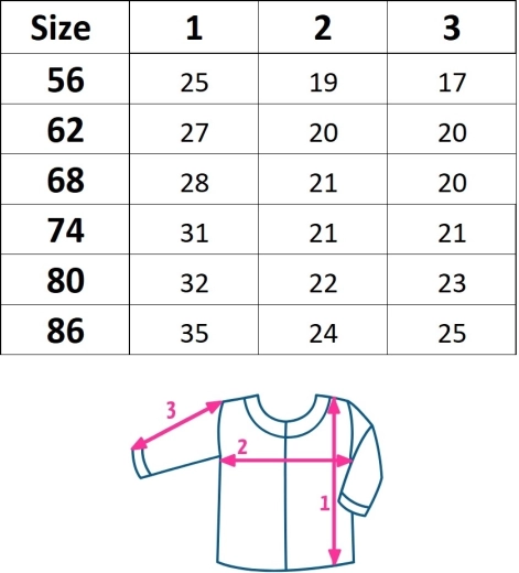 Praktyczne zapięcie na napy na całej długości ułatwia przewijanie i ubieranie bez konieczności zakładania przez główkę. Miękkie lamowanie przy szyi i rękawach zwiększa komfort i utrzymuje kształt nawet po wielokrotnym praniu.