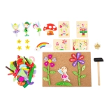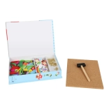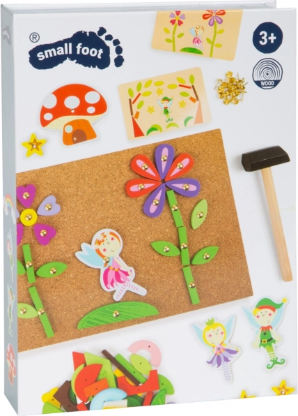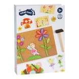 Ten kreatywny zestaw z młotkiem i wróżkami zapewnia dzieciom godziny twórczej zabawy. Elementy z nawierconymi otworami łatwo mocuje się za pomocą gwoździków do solidnej korkowej tablicy, tworząc bajkowe sceny pełne kwiatów, wróżek i grzybków. Poręczny drewniany młotek wygodnie leży w dłoni, a praca z nim jest bezpieczna i intuicyjna.