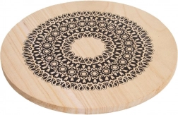 Stylowa drewniana podkładka pod garnek o średnicy 20 cm chroni stół i blat roboczy przed gorącem oraz zarysowaniami. Jest lekka, trwała, a jej powierzchnię zdobi elegancki motyw mandali w czarnym kolorze. Idealna do codziennego użytku w kuchni i jadalni, świetnie sprawdzi się także do serwowania drobnych przekąsek. Praktyczny, ochronny i uniwersalny wybór do każdego domu.
