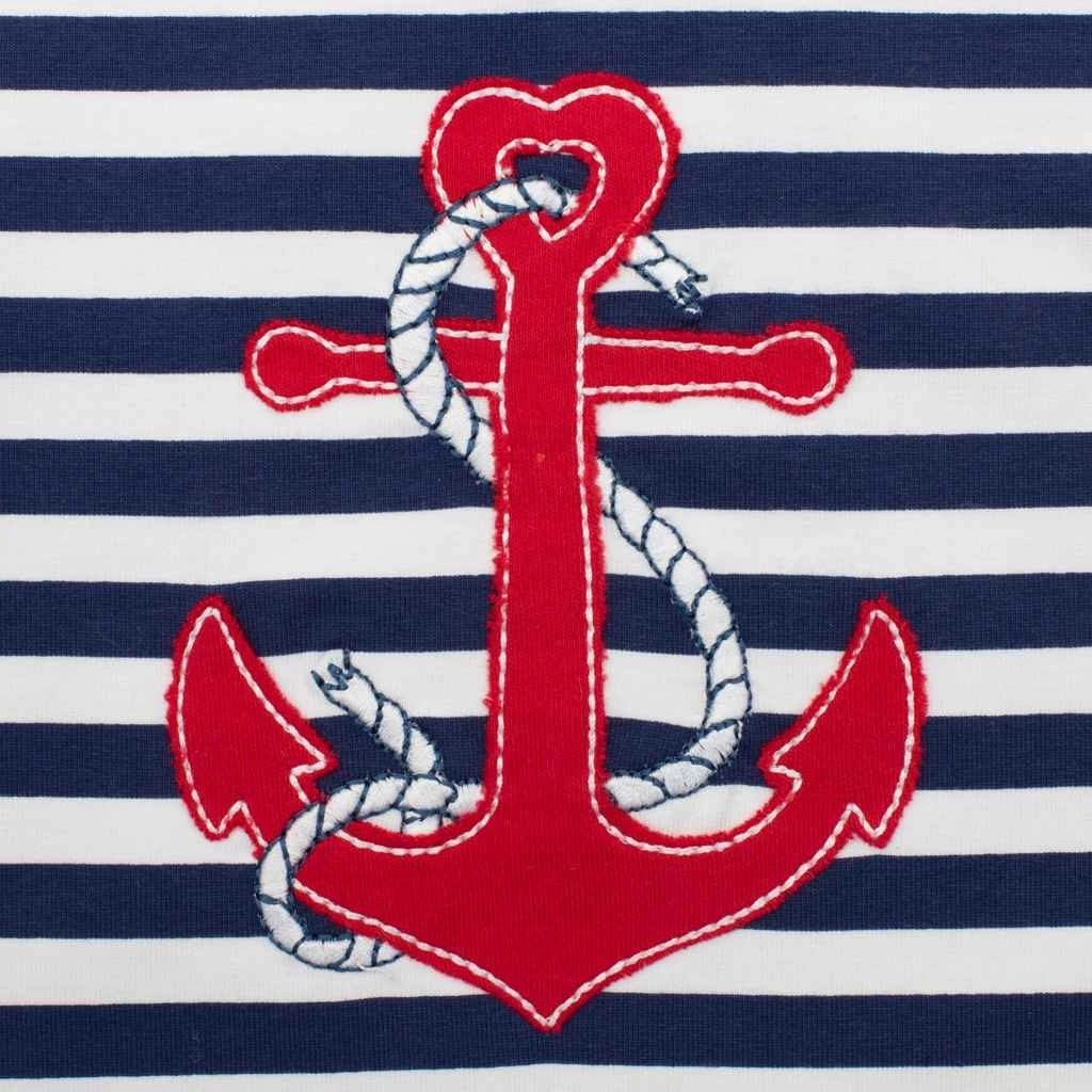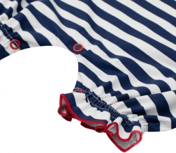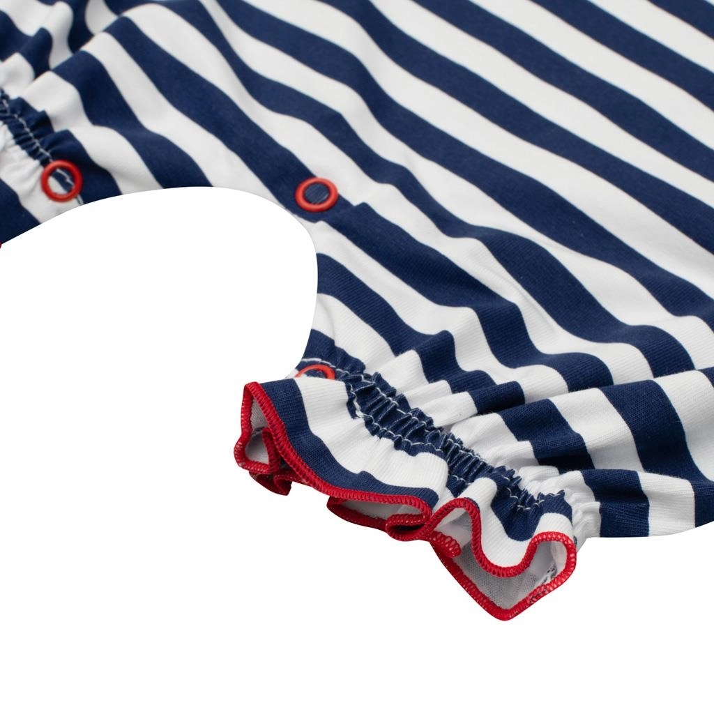 Dziewczęcy letni rampers New Baby Marine to idealny wybór na upalne dni. Lekka i przewiewna 100% bawełna zapewnia maksymalny komfort, a nowoczesne marynarskie paski dodają uroczego wyglądu. Aplikacja kotwicy jest od spodu podszyta tkaniną, dzięki czemu nie podrażnia delikatnej skóry dziecka.