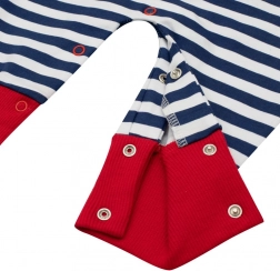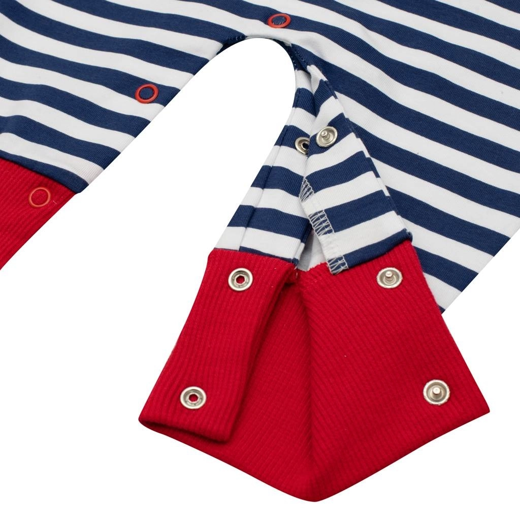 Chłopięcy letni rampers New Baby Marine to idealny wybór na ciepłe dni. Lekka i przewiewna czysta bawełna zapewnia maksymalny komfort, a nowoczesny, pasiasty design i urocza naszywka łódeczki dodają stylu w marynarskim klimacie. Naszywka jest od spodu podszyta tkaniną, aby nie podrażniała wrażliwej skóry.