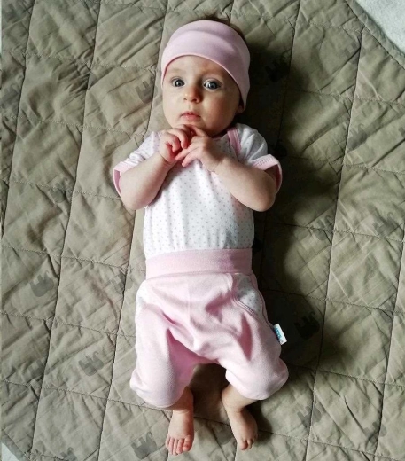 Body ma kolorowe lamowanie wokół dekoltu, rękawków i nogawek oraz zapięcie na napy między nogawkami dla łatwego przewijania. Spodenki wyróżniają się węższymi elastycznymi ściągaczami przy nogawkach i sprytnym krojem zapewniającym swobodę ruchu. Opaska jest elastyczna, dobrze trzyma i wygodnie się nosi.