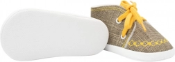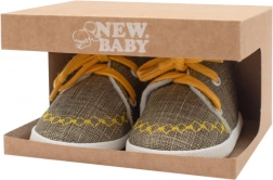 Stylowe niemowlęce buciki w formie tenisówek marki NEW BABY z przyjemnej bawełnianej mieszanki. Są lekkie, mają cienką syntetyczną podeszwę, sznurowanie dla lepszego dopasowania oraz szerokie wnętrze dla swobodnego ruchu palców. Idealne dla maluszków 0–3 miesiące, nie są przeznaczone do chodzenia.