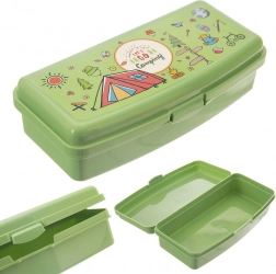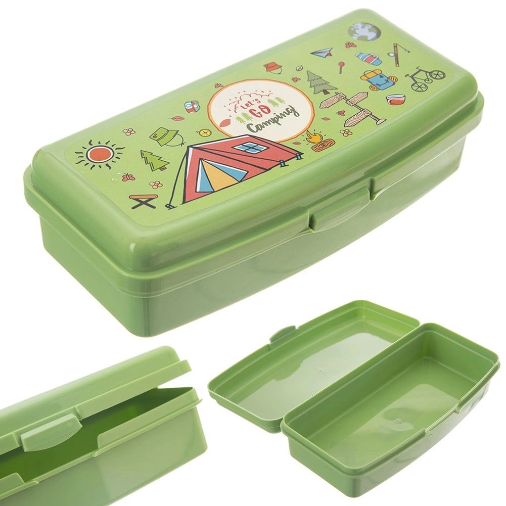 Praktyczne pudełko śniadaniowe o pojemności 500 ml w zielonym kolorze jest idealne na kanapki, przekąski i drobne smakołyki. Ma kompaktowe wymiary 21 × 9,5 × 5,5 cm, solidne wykonanie z wysokiej jakości plastiku i niezawodne zamknięcie na klips, które pomaga utrzymać świeżość. Zdobione atrakcyjnym motywem kempingowym, dzięki czemu dzieci łatwo rozpoznają swoje pudełko.