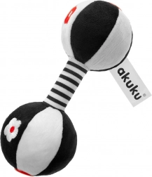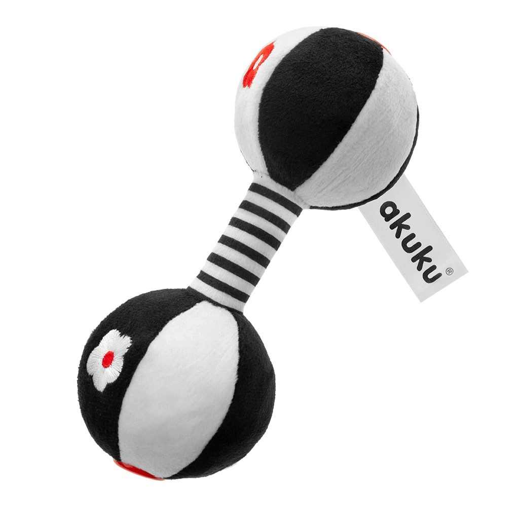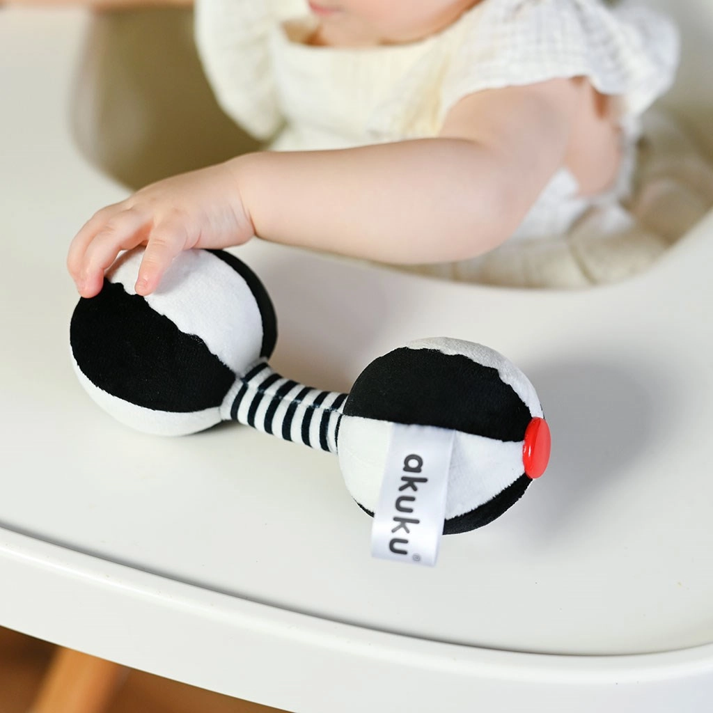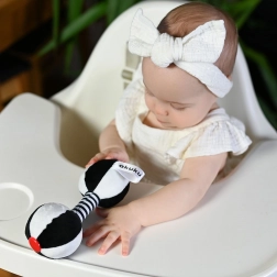 Ta kontrastowa zabawka w kształcie hantli wykonana jest z przyjemnej pluszowej tkaniny, łagodnej dla wrażliwej skóry dziecka. Kontrastowe czarno-białe elementy przyciągają uwagę maluszka i wspierają percepcję wzrokową od pierwszych dni. Wewnątrz znajdują się delikatne dzwoneczki, które podczas poruszania wydają dźwięk i pomagają rozwijać wrażenia słuchowe.