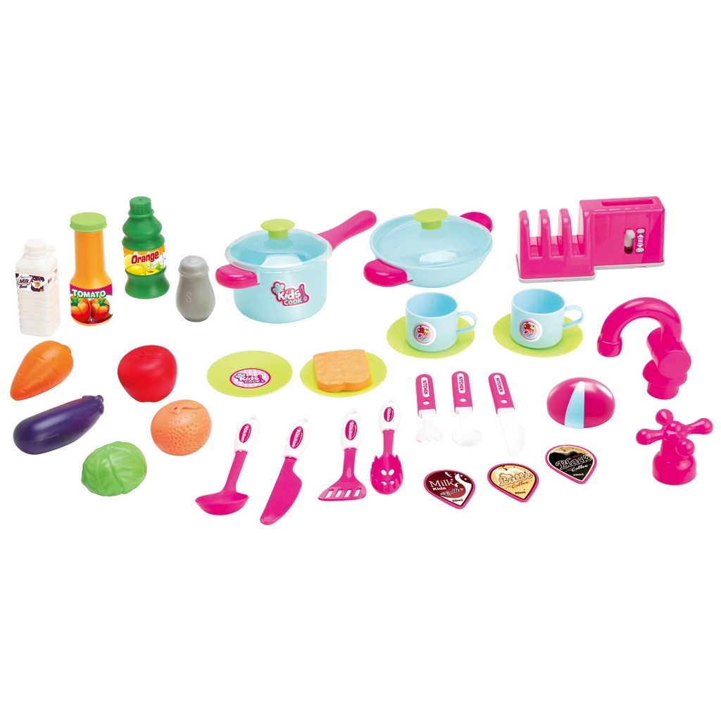 W zestawie znajduje się również ekspres do kawy, opiekacz do kanapek, zlew z baterią oraz okap z haczykami do zawieszania akcesoriów. Praktyczne półeczki i ociekacz na talerze pomagają utrzymać porządek. Konstrukcja została zaprojektowana z naciskiem na bezpieczeństwo i łatwość użytkowania przez dzieci.