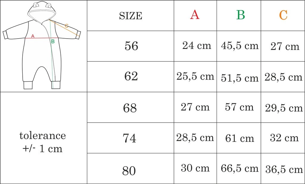 Praktyczne detale, takie jak zawijane mankiety i kaptur z uroczymi uszkami, czynią go idealnym wyborem na codzienne spacery oraz podróże w wózku. Materiał długotrwale utrzymuje swój kształt i wygląd, więc kombinezon prezentuje się świetnie nawet po wielokrotnym praniu.
