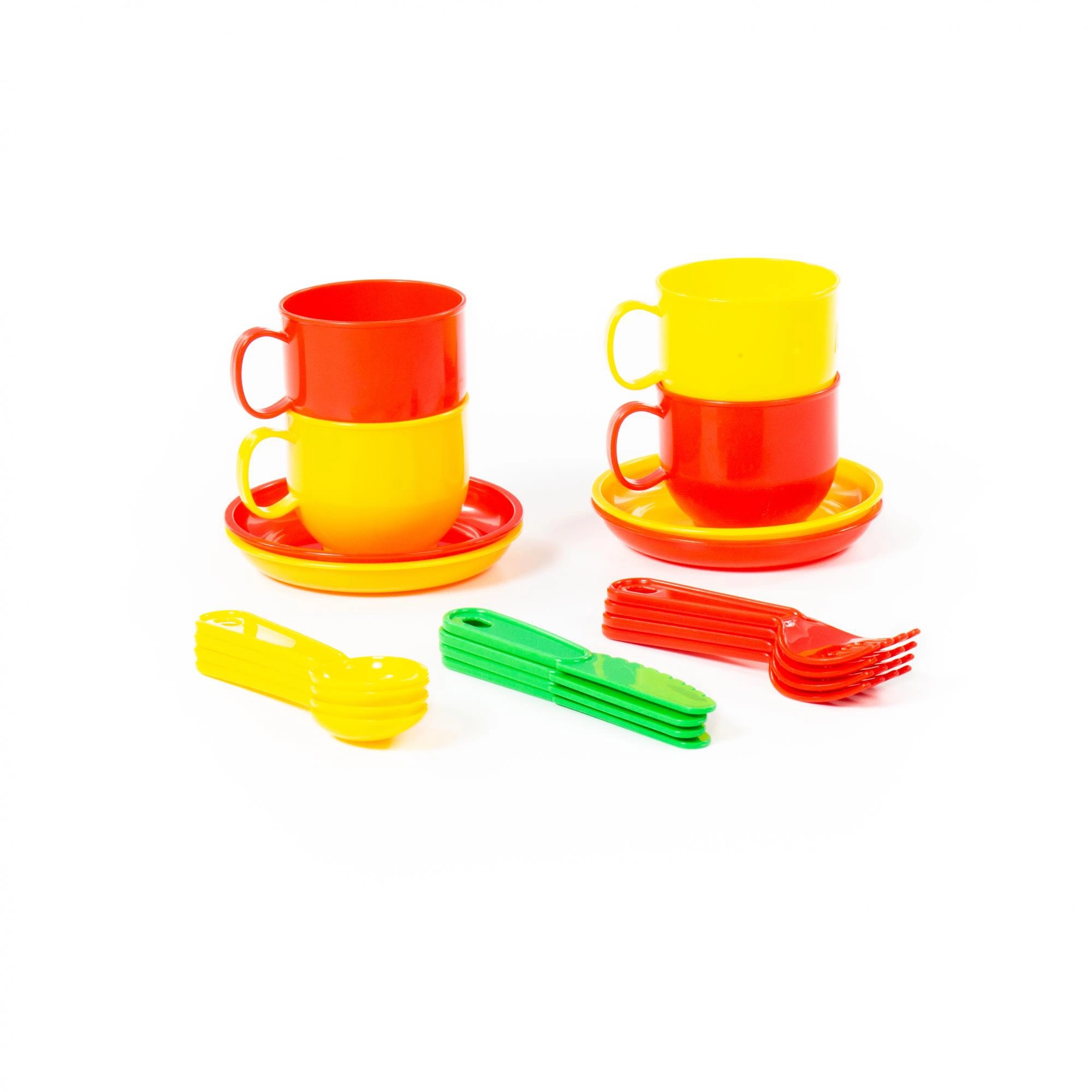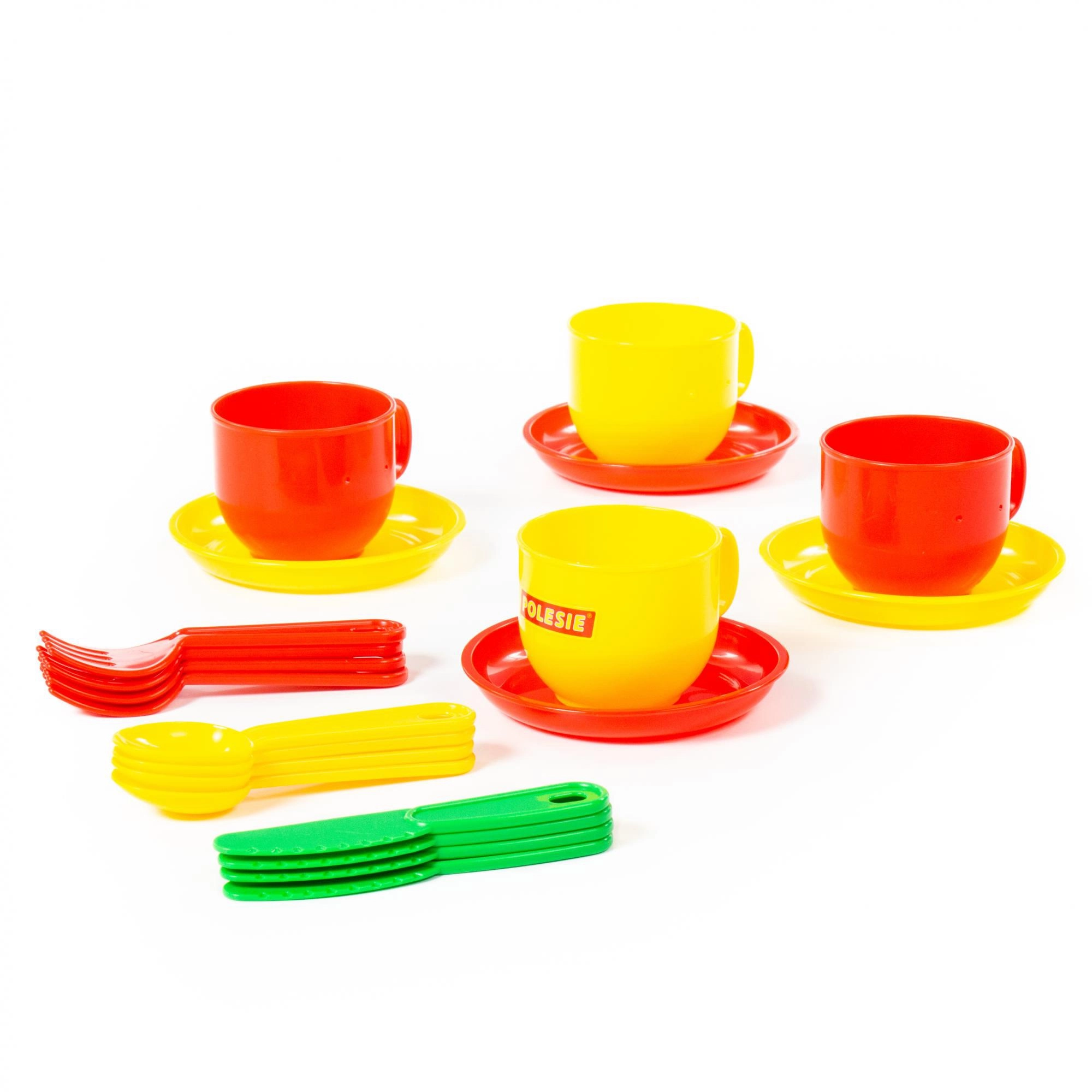 Kolorowy dziecięcy zestaw obiadowy dla 4 osób zawiera tackę, 4 talerzyki i 4 kubeczki z kompletnym sztućcem. Idealny do zabawy w podwieczorek i serwowania. Dzięki lekkim i wytrzymałym tworzywom zestaw jest bezpieczny i łatwy w utrzymaniu. Lekki, wytrzymały i łatwy do umycia zestaw wspiera zabawy w odgrywanie ról, małą motorykę oraz grę towarzyską.
