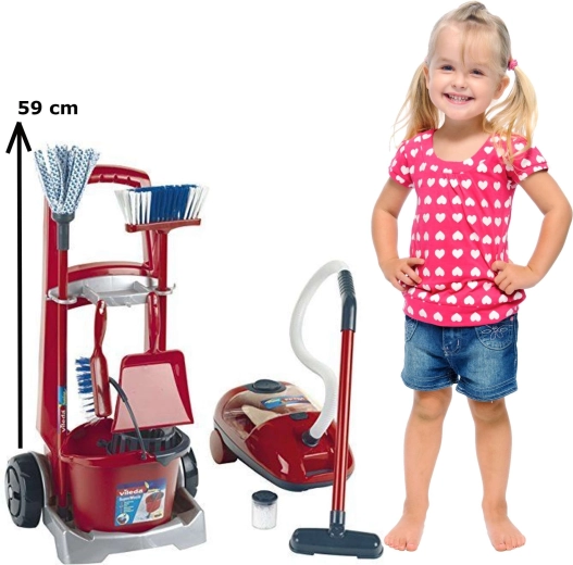 Zestaw zaprojektowano tak, aby dzieci mogły bezpiecznie naśladować codzienne sprzątanie. Solidny wózek w czerwono-szarej kolorystyce z dużymi kołami jest łatwy w prowadzeniu i przewiezie wszystkie akcesoria na swoje miejsce. Zabawkowy odkurzacz w kolorze czerwonym ma przezroczysty pojemnik i podczas zabawy wciąga dołączony granulat, który po napełnieniu można łatwo wysypać – jeszcze bardziej realistyczny jest także dźwięk odkurzania.