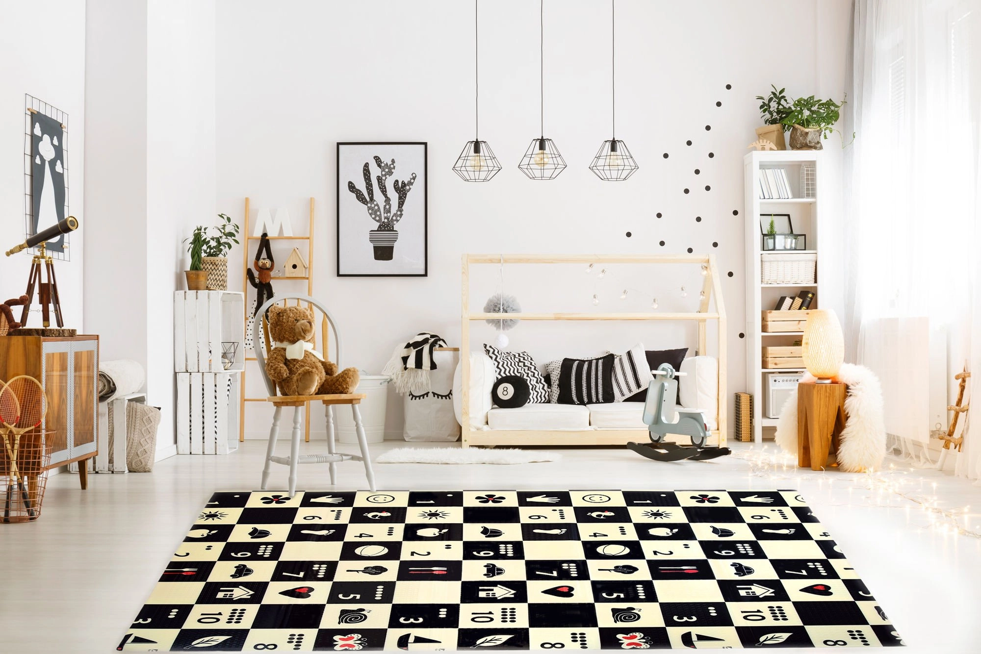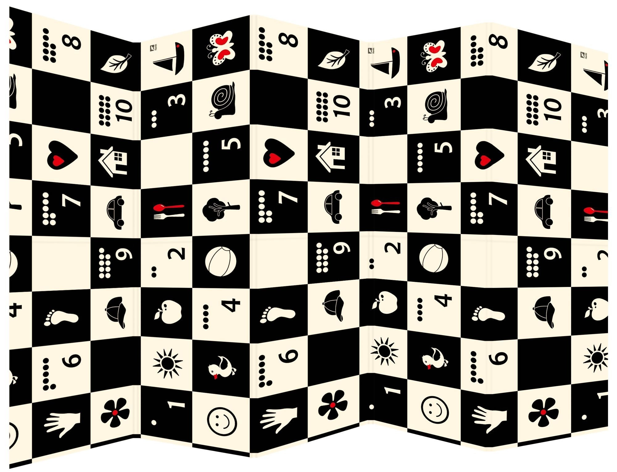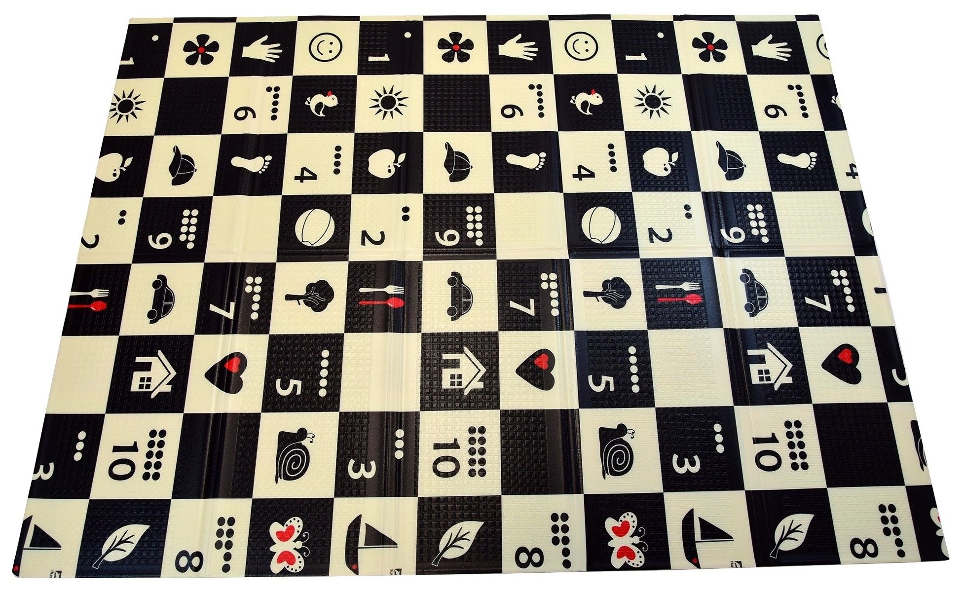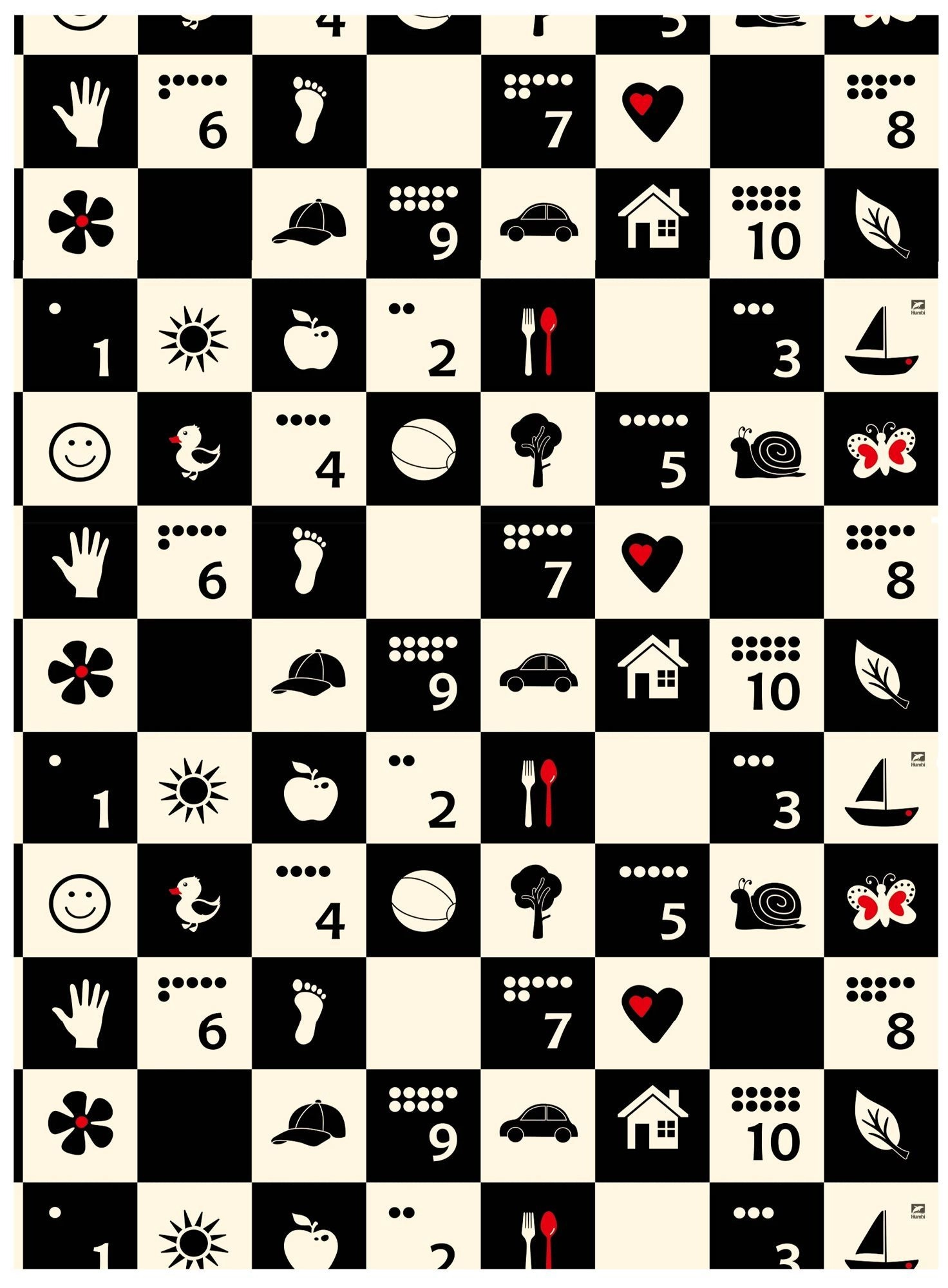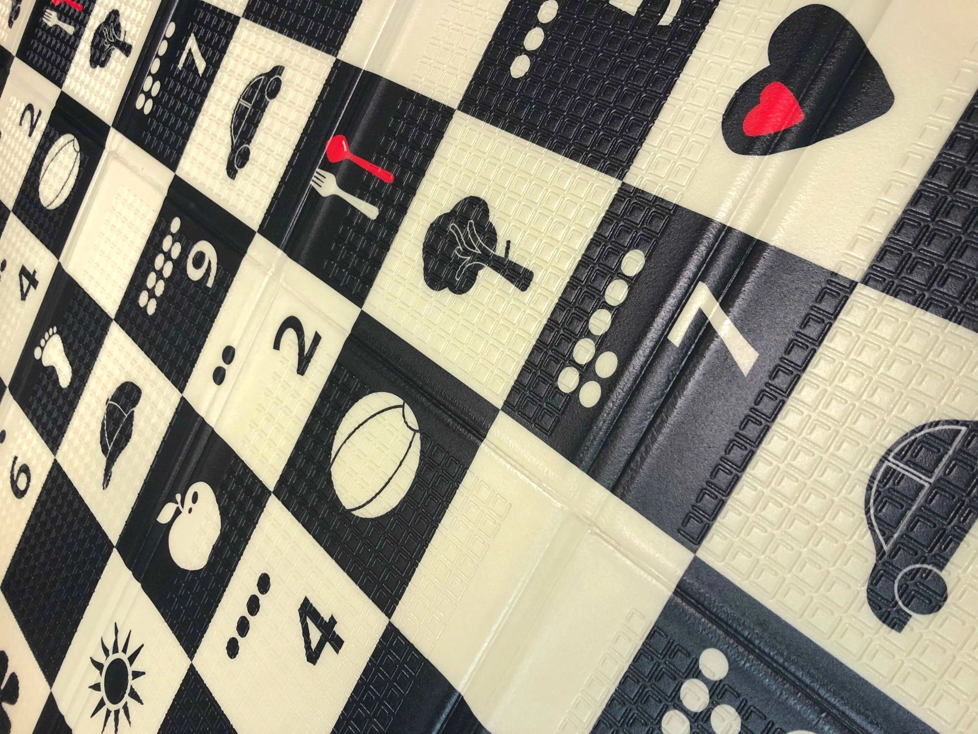 Czarno-biała szachownica z prostymi ikonami stymuluje wzrok, wspiera inteligencję wizualno-przestrzenną i przyciąga uwagę maluszków.