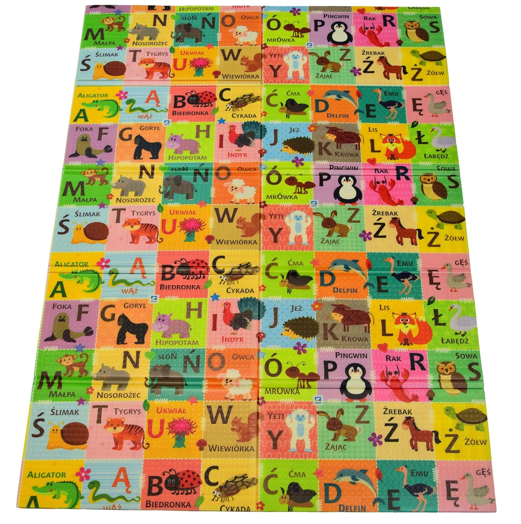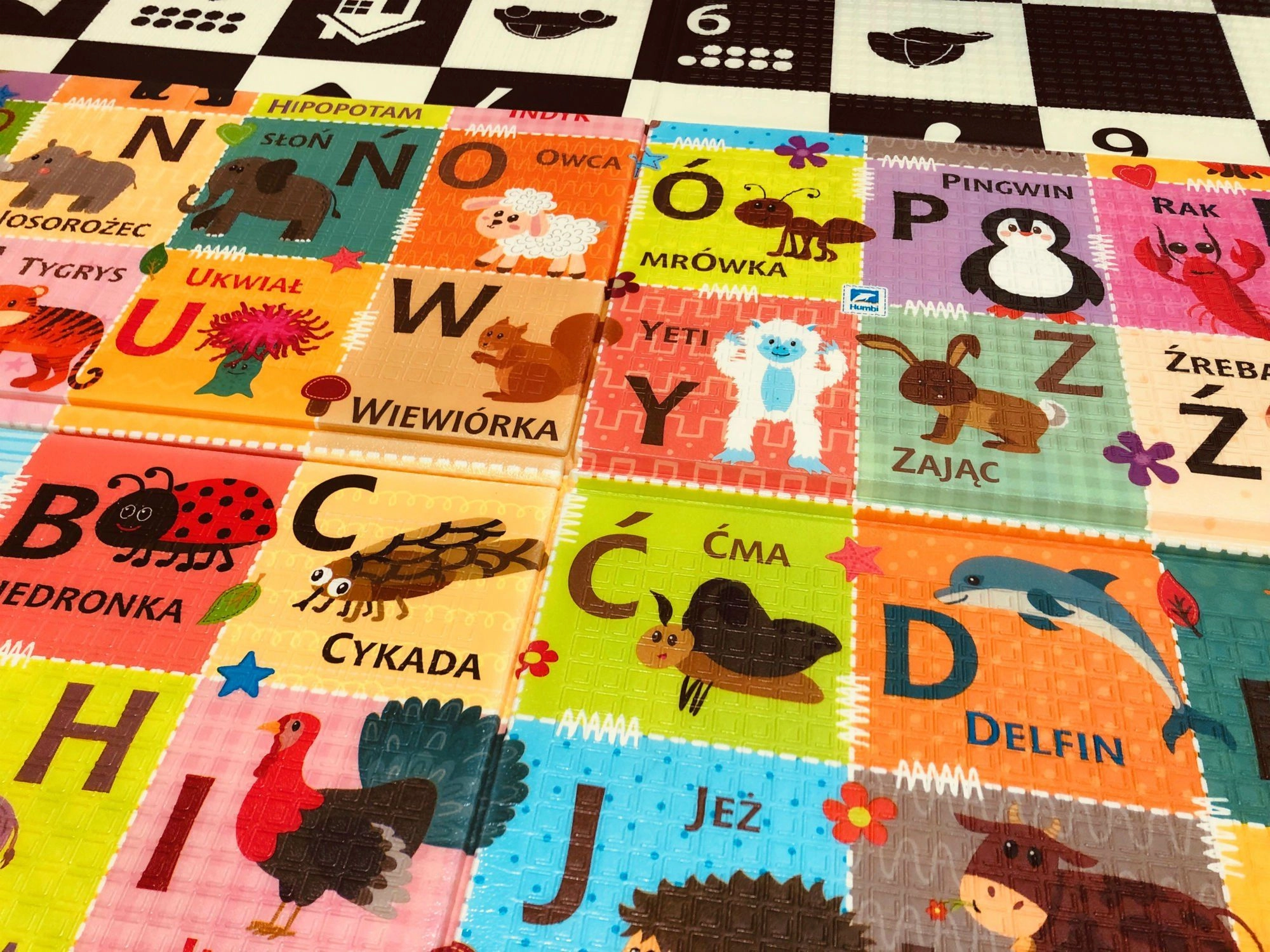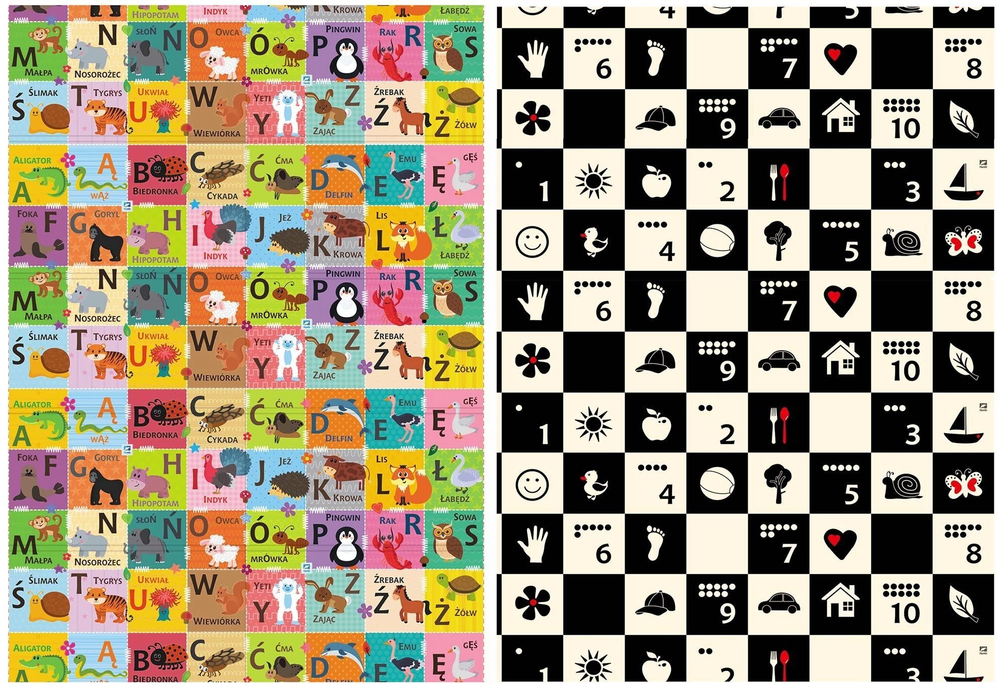 - Dwustronny design: kontrastowe liczby i symbole + kolorowy alfabet ze zwierzątkami