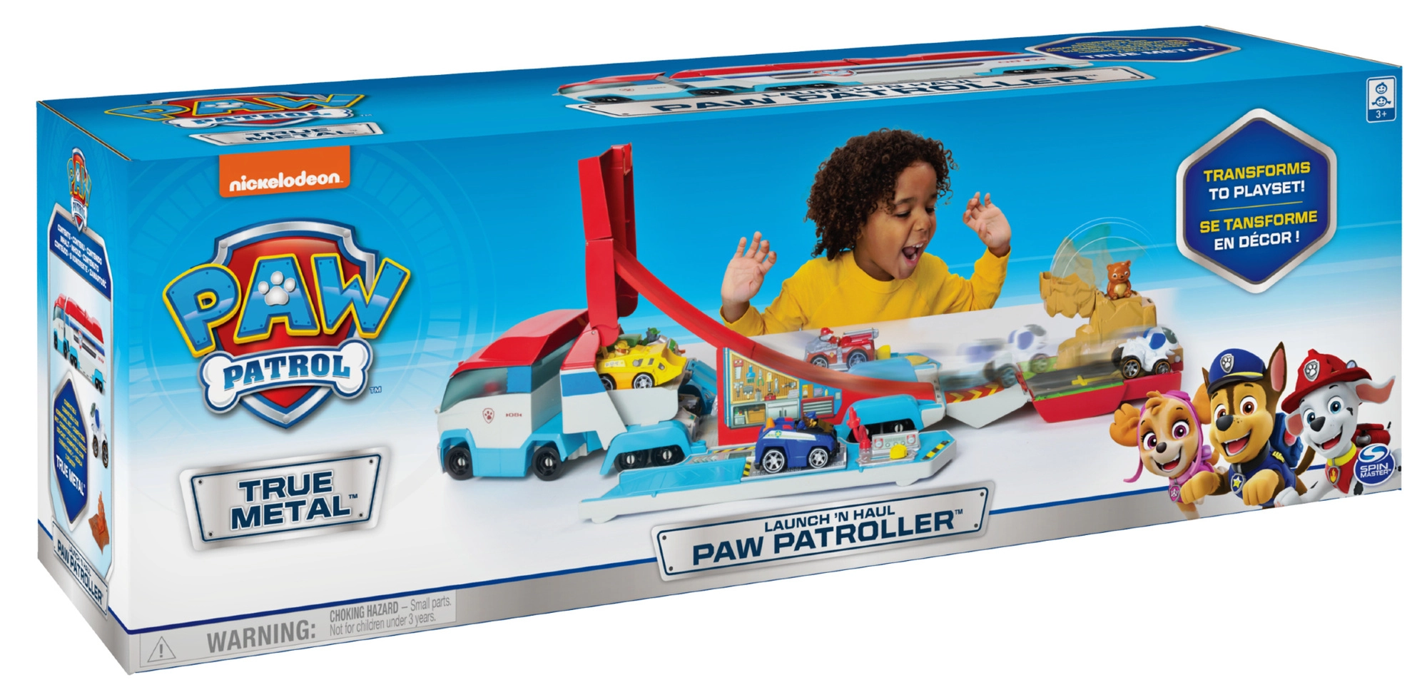 Duża, transformująca się ciężarówka z serii Psi Patrol od Spin Master w mgnieniu oka zmienia się w akcyjną stację zabaw z rampą. Oferuje wyrzutnię autek, 12 kół dla stabilnej jazdy, misje ratunkowe takie jak gaszenie pożaru, podnośnik i ratowanie niedźwiedzia. Mieści aż 7 metalowych autek (True Metal, sprzedawane oddzielnie) i zawiera Robo-psa do natychmiastowej zabawy.