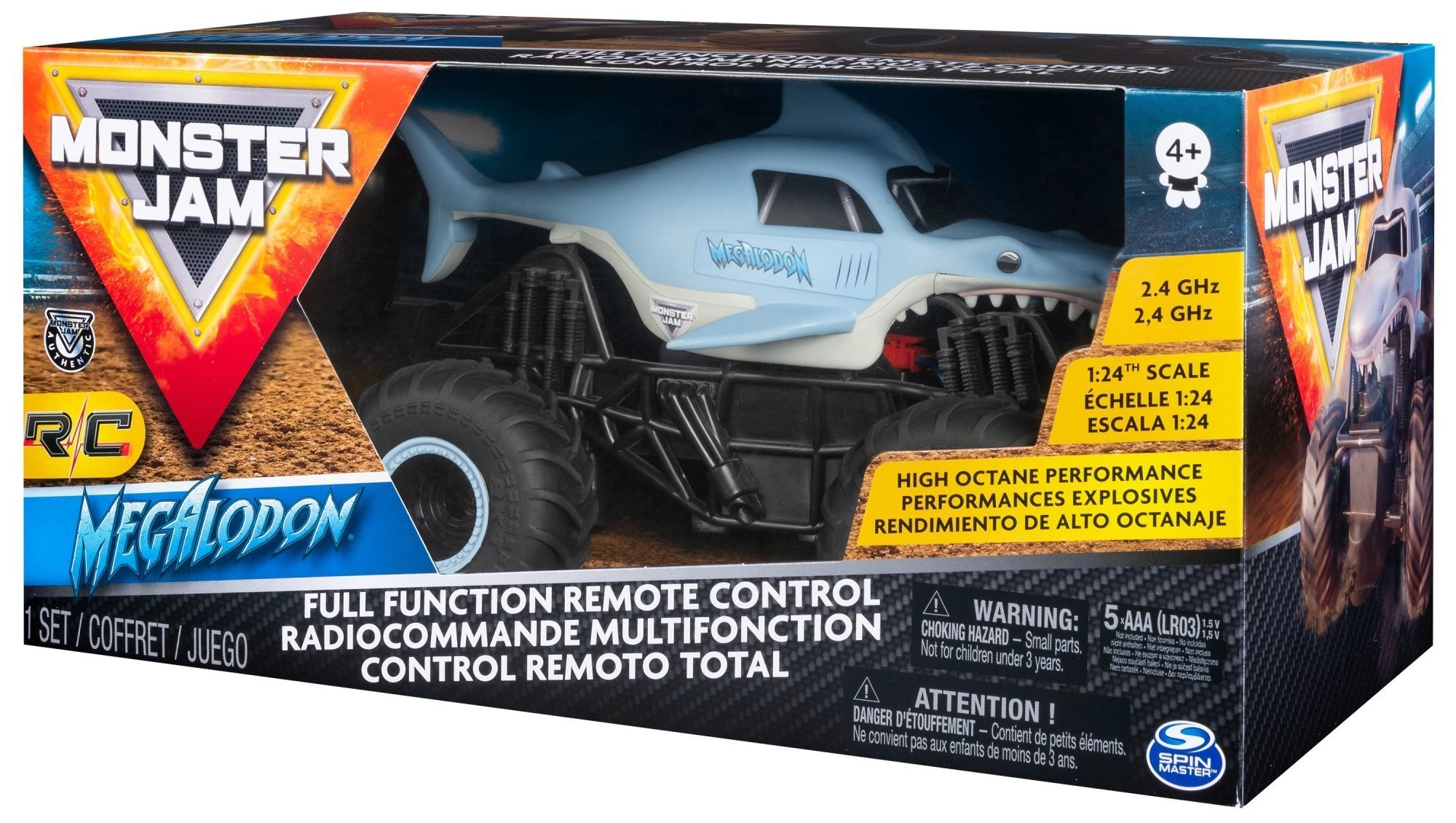 Licencjonowane auto RC MONSTER JAM Megalodon oferuje autentyczny wygląd kultowego monster trucka z niebieską karoserią w stylu rekina, płetwami i zębami. Skala 1:24 jest idealna do domowych wyścigów i pierwszych przygód z RC.