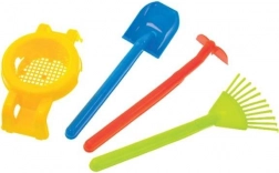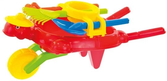Duże, ruchome koło zapewnia płynną i stabilną jazdę po różnych nawierzchniach, a podwójne podpory umożliwiają bezpieczne odstawienie taczki. Ergonomiczne rączki są dopasowane do dziecięcych dłoni i wspierają pewny chwyt. W opakowaniu nie brakuje praktycznych dodatków: grabki, łopatka, motyczka i sitko – idealne do przenoszenia ziemi, zbierania liści czy przesiewania piasku.