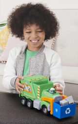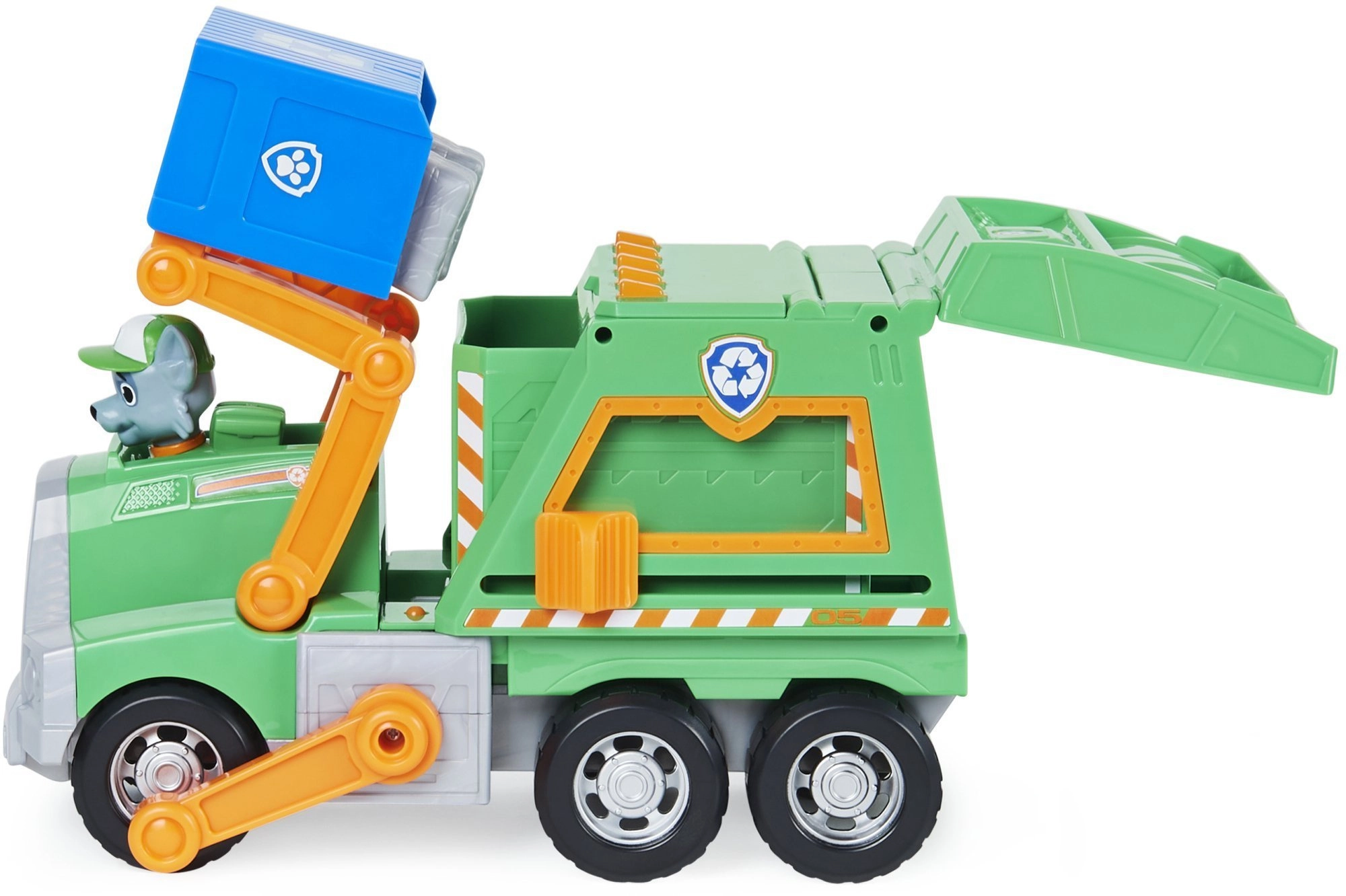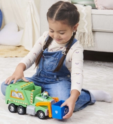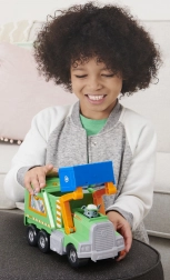 Wyrusz na ratunkową misję po czystsze miasto z Rockym i jego zieloną ciężarówką do recyklingu. Dzieci mogą podnosić niebieski kosz, ładować „śmieci” i uczyć się segregacji. Autentyczne detale z serialu Paw Patrol wspierają wyobraźnię i zabawę fabularną.
