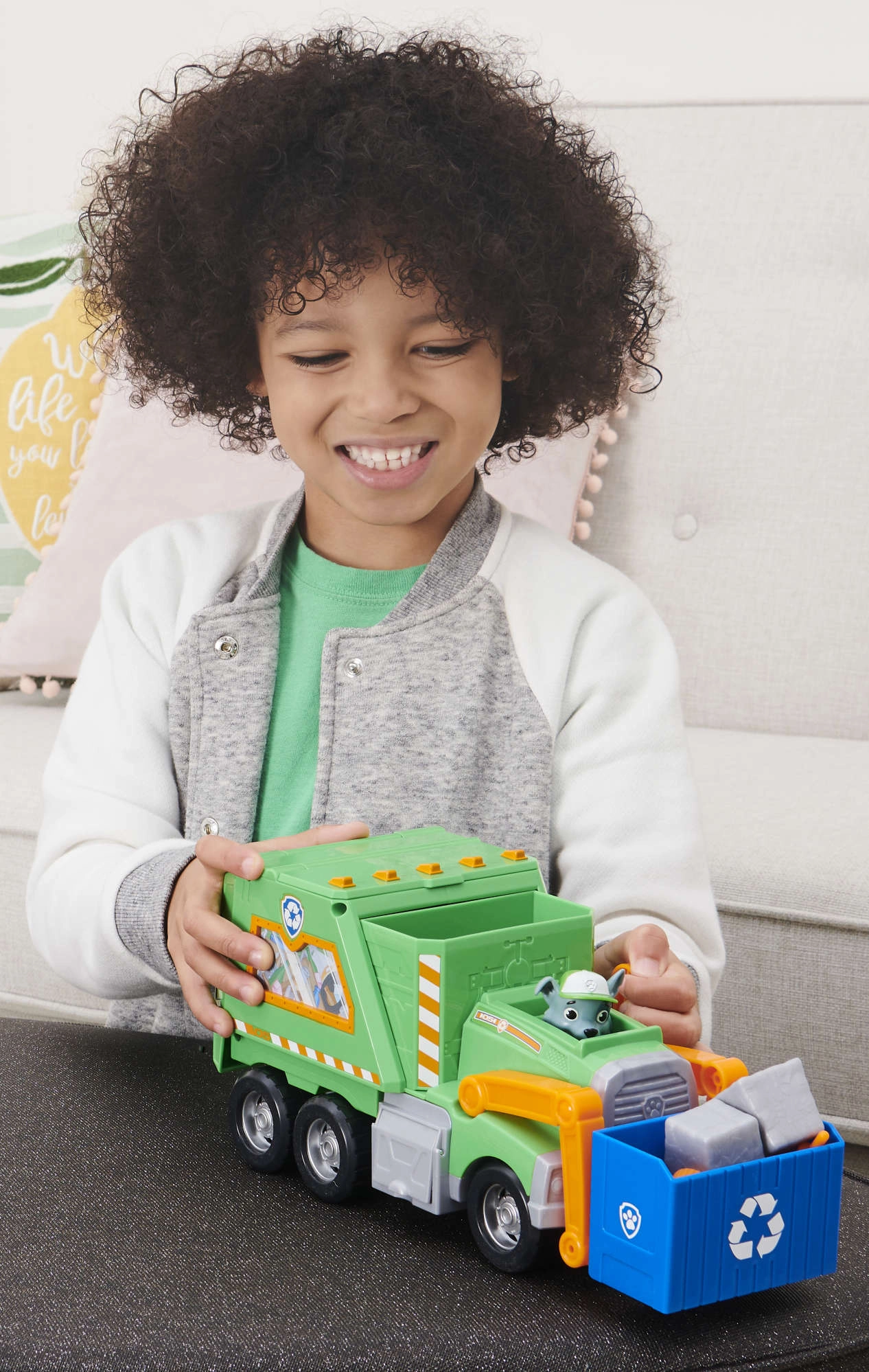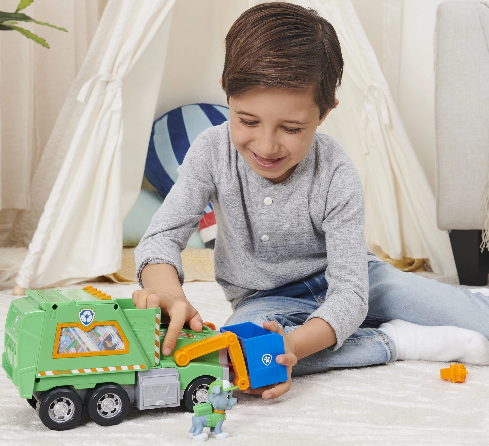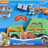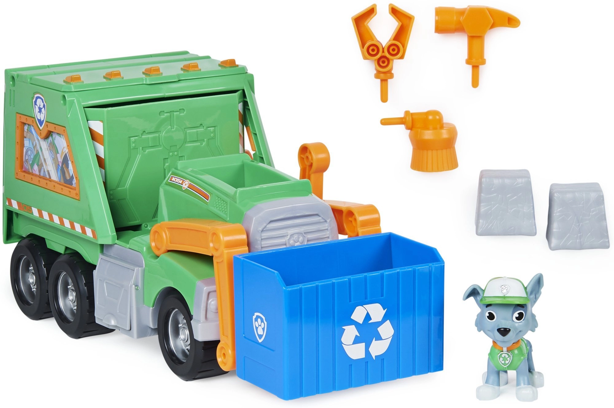 - Ciężarówka do recyklingu, figurka Rocky’ego, niebieski kosz, akcesoria do zabawy („śmieci” i narzędzia)