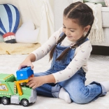 Boczne i czołowe ramię łatwo unosi niebieski kosz na recykling i wysypuje jego zawartość na pakę. Dzieci doświadczą realistycznego załadunku i wyładunku.