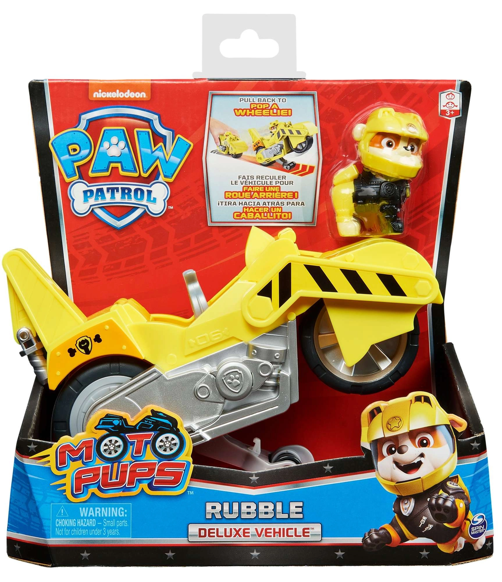 Przeżyj pełną akcji jazdę z bohaterami PAW PATROL! Żółty motocykl Rubble Moto Pups z figurką oferuje napęd typu pull-back, stabilne, duże koła oraz możliwość jazdy na tylnym kole dzięki dodatkowym kółkom. Idealna zabawka do kreatywnej i kaskaderskiej zabawy dla dzieci od 3 lat.