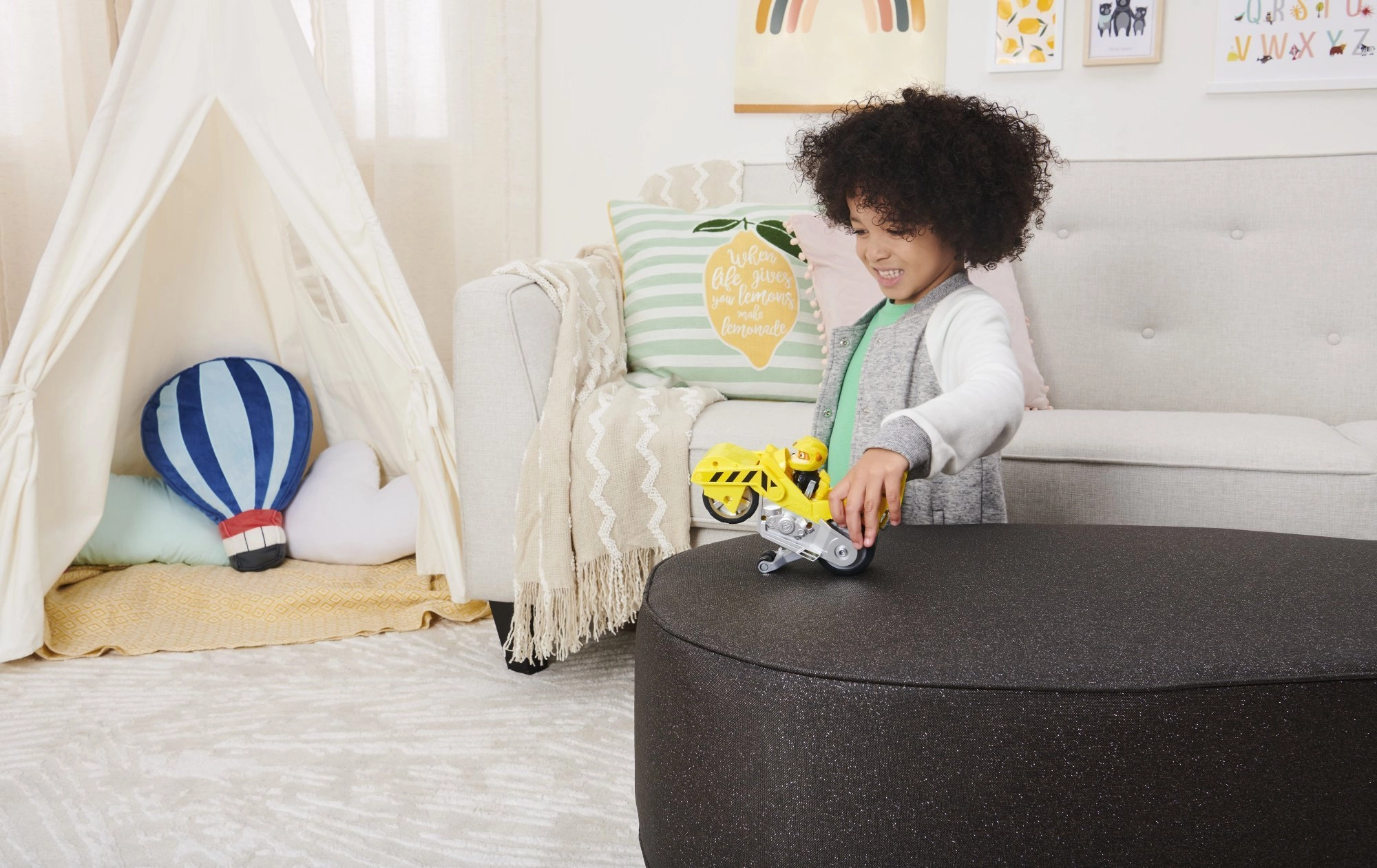 Dzięki dodatkowym kółkom pomocniczym motocykl wykonuje efektowne wheelie – jazdę na tylnym kole. Figurkę Rubble można posadzić w siodle i wyruszyć na przygody, które rozwijają wyobraźnię, małą motorykę oraz miłość do ulubionych bohaterów.