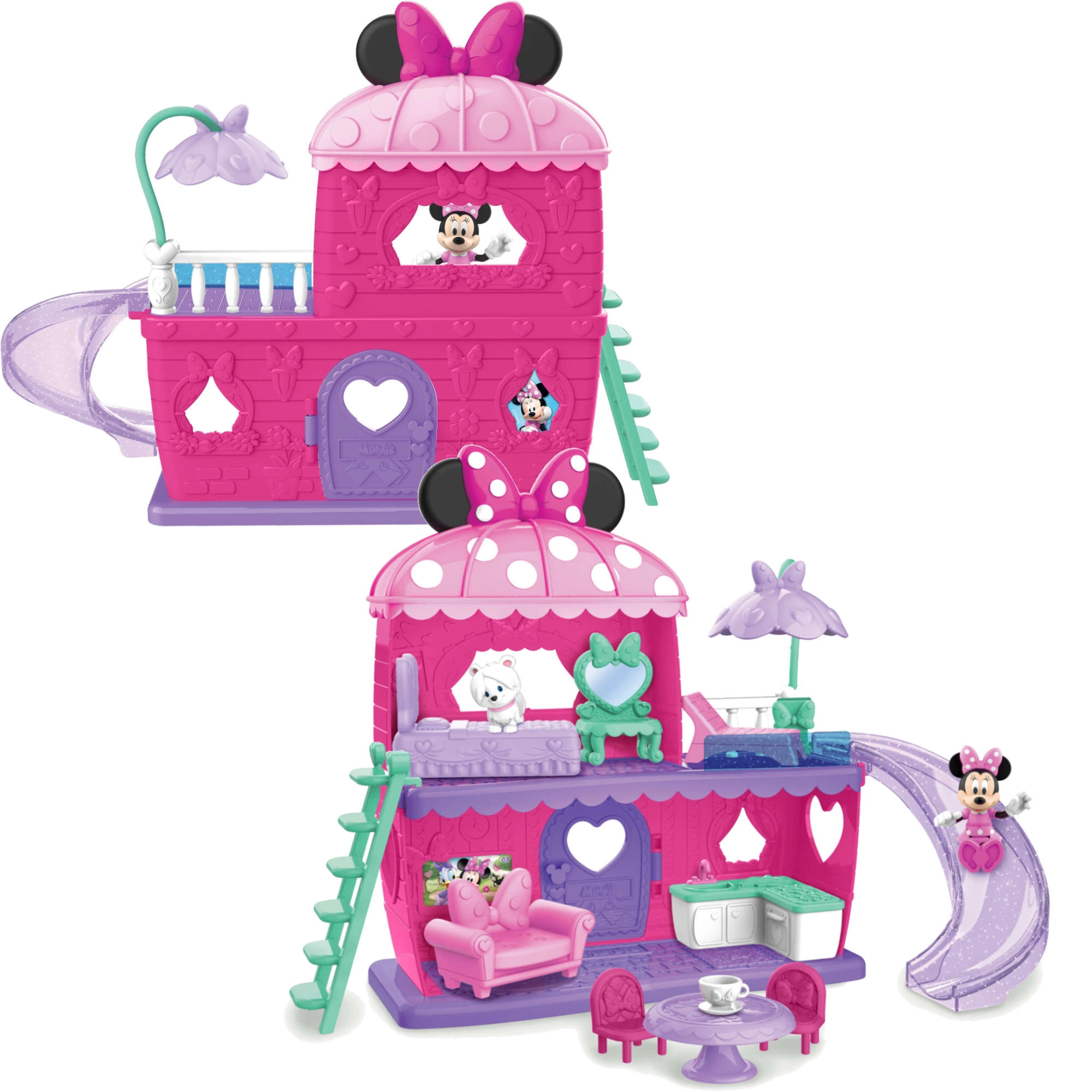 Odkryj magiczny różowy domek MINNIE MOUSE z dwoma piętrami i dwiema pomieszczeniami – na górze znajduje się przytulna sypialnia z balkonem, a na dole salon z aneksem kuchennym. Dzięki otwartej tylnej stronie zabawa jest przejrzysta i łatwo dostępna ze wszystkich stron.