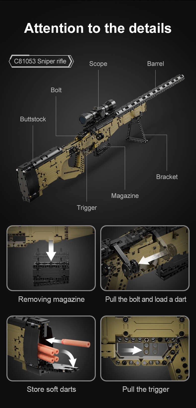 Zbuduj realistyczny karabin snajperski z zestawu CADA składającego się z łącznie 978 elementów. Model SNIPER RIFLE oferuje funkcjonalne elementy, takie jak magazynek, optyka i pasek transportowy. Wysokiej jakości klocki są kompatybilne z innymi markami i doskonale rozwijają umiejętności manualne oraz kreatywność.