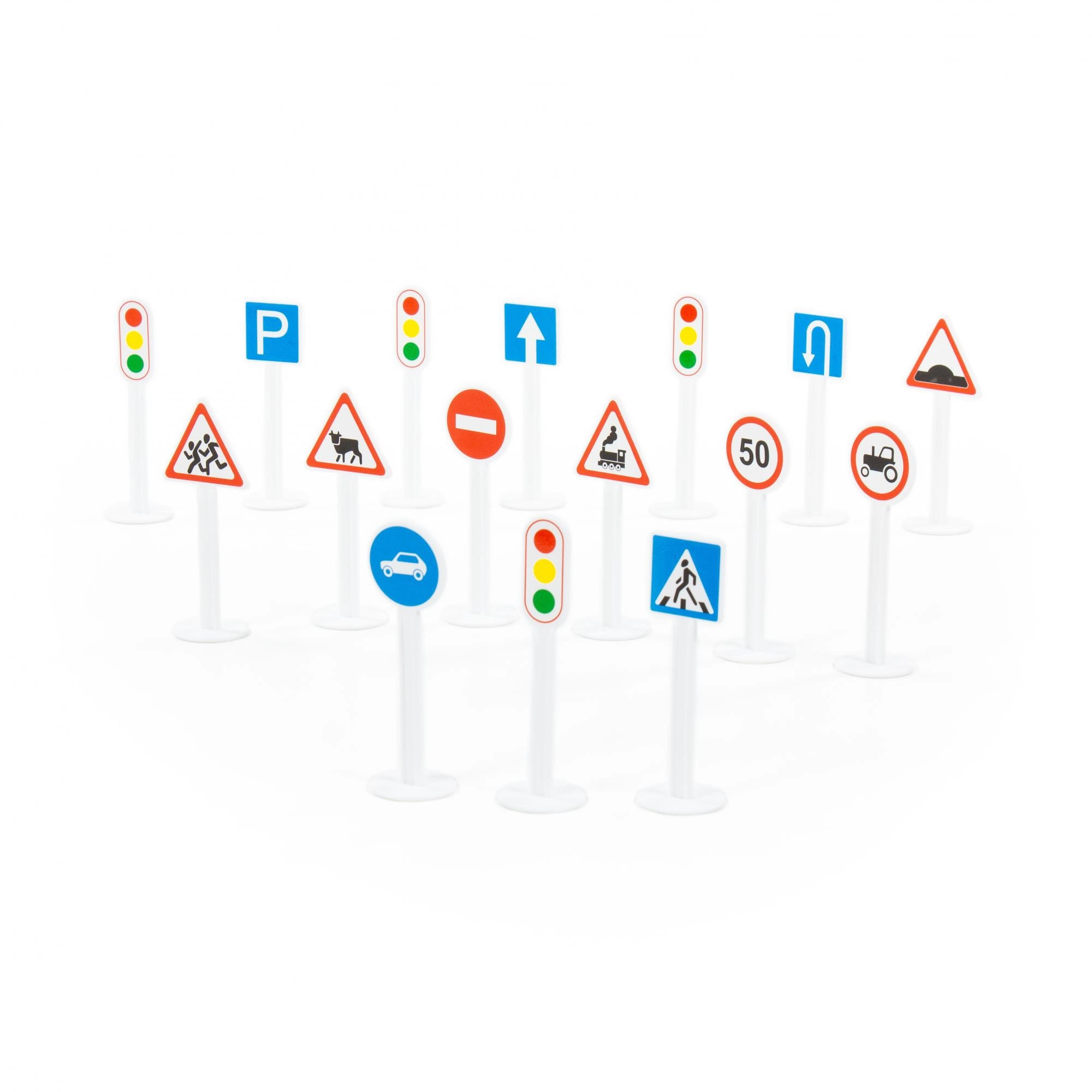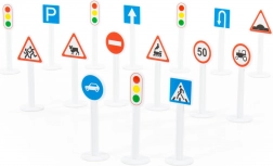 W opakowaniu znajdziesz 16 sztuk znaków o wysokości około 9,5 cm oraz naklejki do ich oznaczania. Dzięki lekkiej plastikowej konstrukcji dzieci łatwo nimi manipulują i mogą ćwiczyć orientację w ruchu drogowym – od przejścia dla pieszych przez zakaz wjazdu po ograniczenie prędkości.